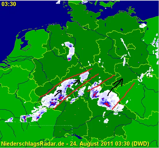 Der Cluster aus Bayern verstärkte sich auf seinem Weg nordostwärts und schloss sich mit einem weiteren, neugebildeten Komplex in Bayern zusammen. Als großer "Batzen" (MCS ?) ging es weiter nordostwärts. Aus der Linie im Südwesten hat sich über Rhein/Main und Hessen im weiteren Verlauf ebenfalls ein Cluster gebildet, der gen Thüringen zog.