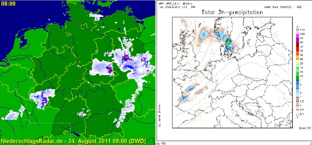 Haben die Modelle diese morgendliche Entwicklung am 24. vorhergesagt? KAUM... Der folgende Vergleich zeigt als Referenz das Radarbild von 08:00 MESZ und den Modellprognosen zum Termin 06Z (also 08:00 Uhr MESZ wie das Radar):