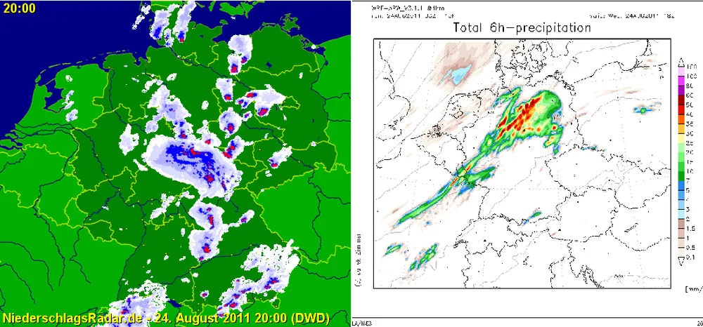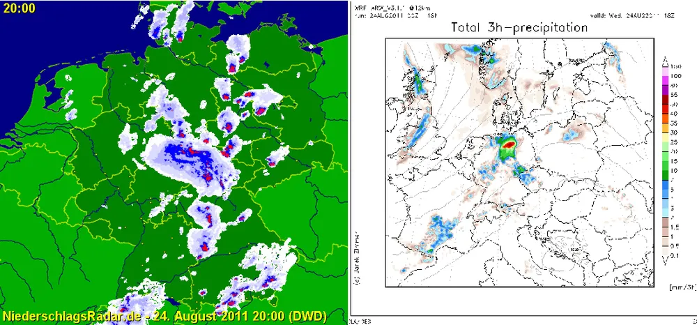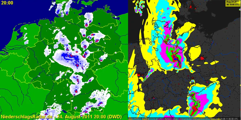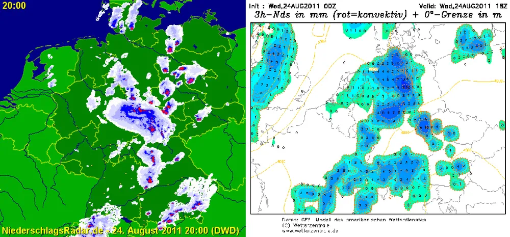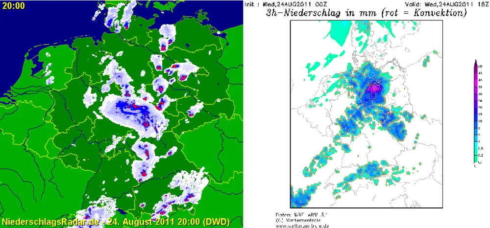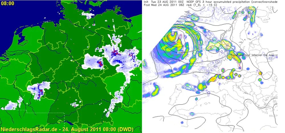 Nachfolgend soll die Problematik der Modelle mit der Schwergewitterlage vom 24.08.2011 einmal dargestellt werden. Als Ausgangslage hatten wir einen großen Trog über Westeuropa, dem ein Hochdruckgebiet über Osteuropa entgegenstand. Im Nordwesten Deutschlands war eine warme Luftmasse zugegen, während im übrigen Teil eine heiße und feuchte Luftmasse vorzufinden war. Diese zeichnete sich durch hohe CAPE-Werte um die 1.500 J/kg aus. Diese zwei Luftmassen wurden über Deutschland durch eine Luftmassengrenze getrennt. Randtröge und Teiltiefbildungen sorgten dabei immer wieder für die Auslösung großräumiger, unwetterartiger Gewittercluster, wie auch an diesem Tag: Ein Randtief, dass sich über Frankreich gebildet hatte, zog nordostwärts über den Ärmelkanal zur Nordsse und weiter gen Norwegen.