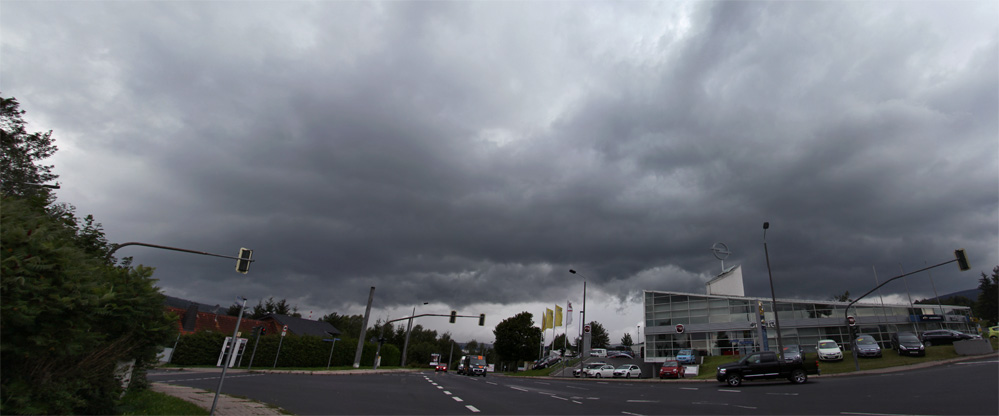 Im Rennsteigtunnel überlegte ich, wo man sich in der Ecke am Besten postiert um guten Blick zu haben. Dafür eignet sich dieses Terrain nun wirklich nicht, zumindest was kurzfristige Entscheidungen angeht. In Zella-Mehlis rätselte ich Hin und Her, Blick in den Atlas (schneller als das Navi :zwinker ) und das Wissen um die näher rückende Front. Bevor ich mich nach Oberhof quäle, dann doch lieber hier vor Ort bleiben. So fuhr ich Richtung Suhl und irrte in der Stadt umher. Irgendwann stellte ich das Auto mal irgendwo ab und fotografierte an einer Kreuzung, damit am Ende wenigstens etwas vorzuzeigen ist: