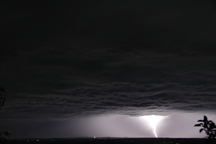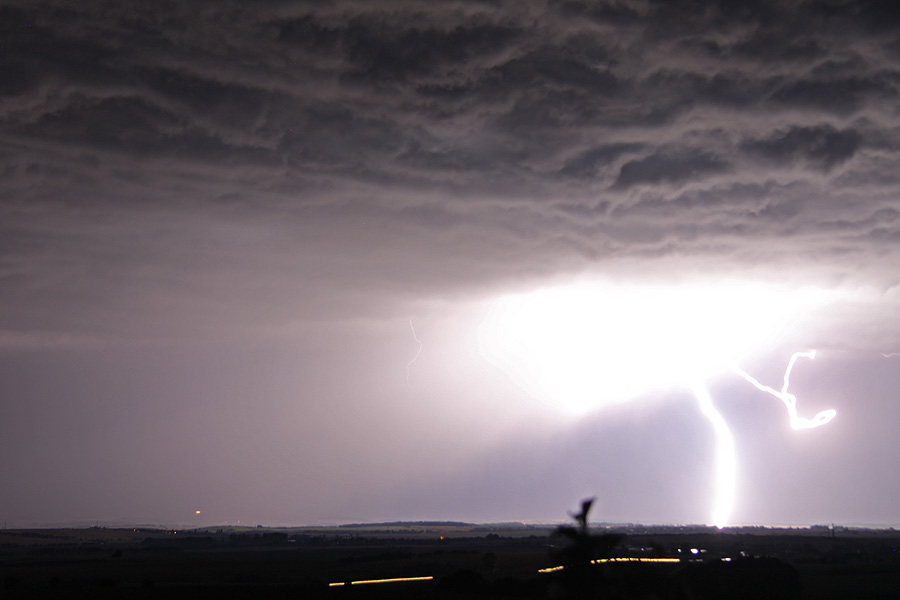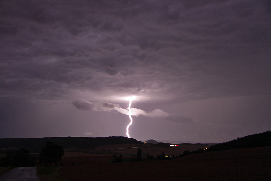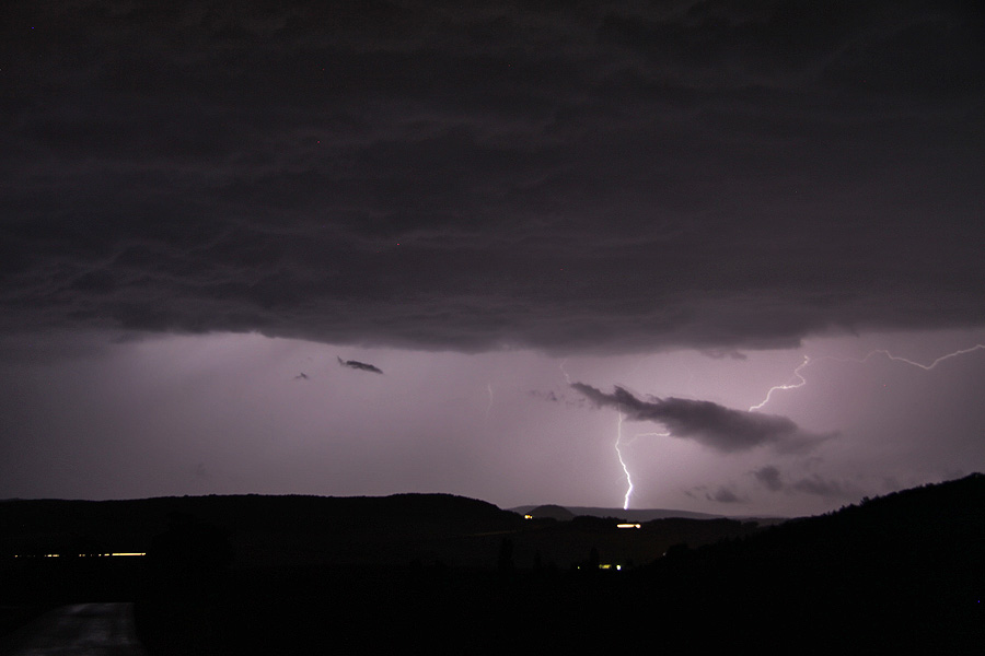 Leider setzte schon recht früh Regen ein, vor dem wir erwartungsgemäß resignieren mussten. Wir entschlossen uns, wieder zurück zu fahren. Bis Nordhausen fiel der Niederschlag immer wieder schauerartig verstärkt, dazwischen auch immer wieder teils helles Leuchten durch nahe Einschläge. Zurück an der Hainleite hofften wir auf eine noch etwas aktive Zelle die in dem "Batzen" noch auszumachen war. Leider hatte ich in der Manuell - Einstellung (ja Andre, bitte nichts dazu sagen