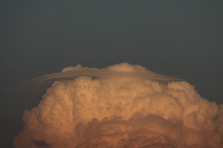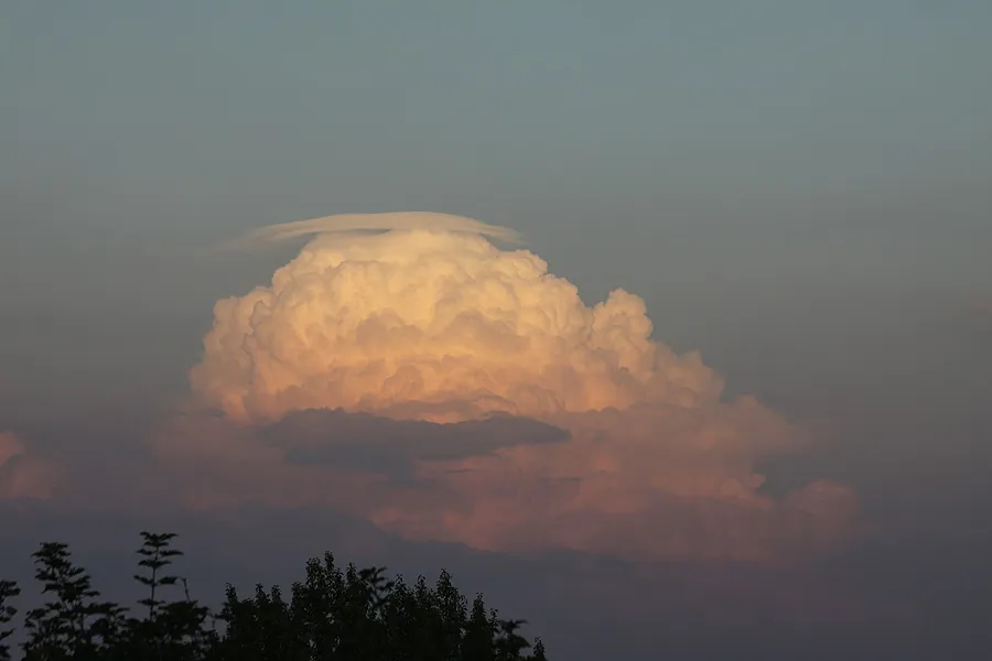 Ein herrlicher Cumulus (Cu) congestus (con) mit Kappe "pileus" (pil). Die Kappe zeigt für sehr kurze Augenblicke das Durchstoßen einer Sperrschicht (Inversion) in der Höhe an.