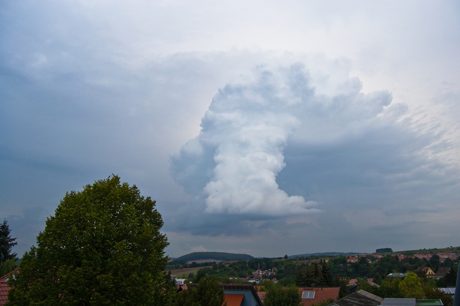 Die zweite Kuriosität war, dass der Kern des Gewitters tatsächlich meinen Standort erreichte und sich in Form einiger sehr heller Wolkenblitze entlud. Einige Erhellungen mussten dem Donner nach zu urteilen auch Einschläge in die Hainleite gewesen sein. Da durch den Starkregen die Umgebung nun völlig verdunkelt war, stieg der Gruselfaktor erneut und ich erwartete jeden Moment, dass ein Gremlin an eine der Fensterscheiben klatscht. Gott sei Dank war das nicht der Fall.