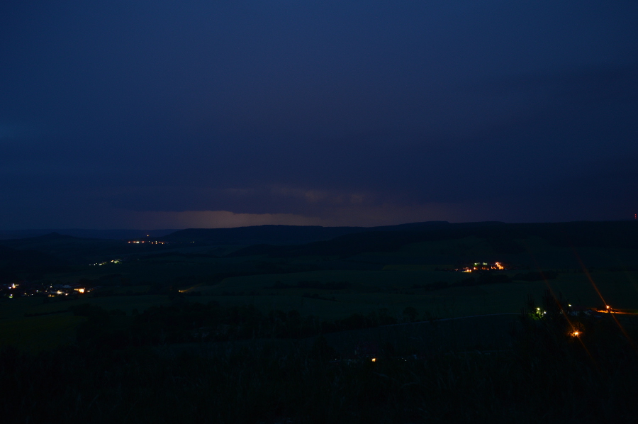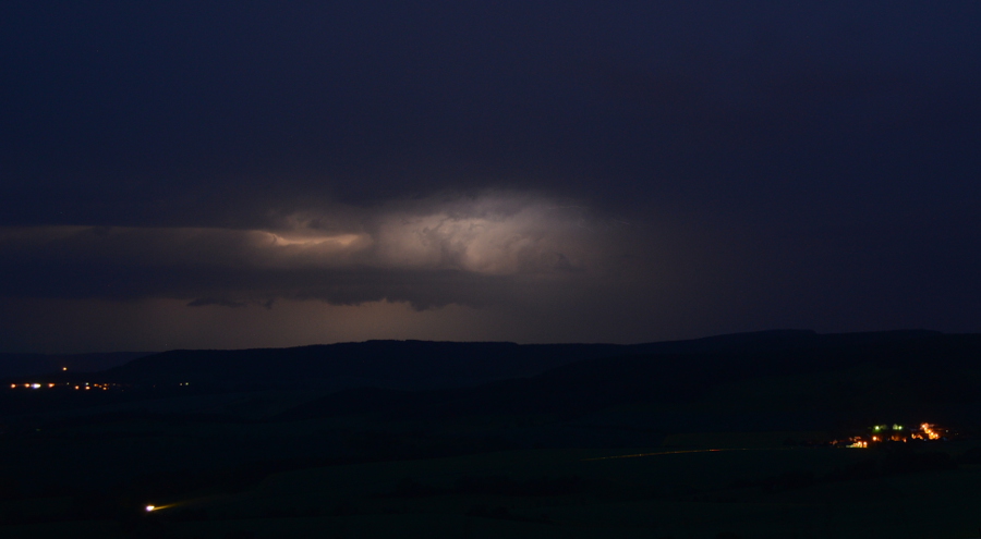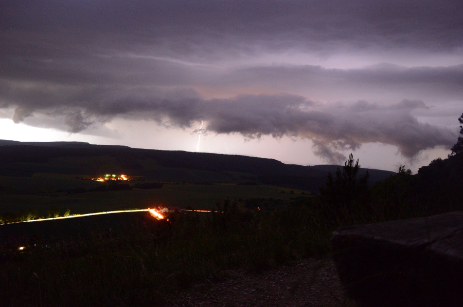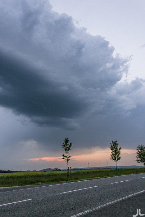 Eine erste Zelle zog über Heiligenstadt, wo jedoch der Schirm sehr stark verweht wurde, aber einen schönen geneigten Aufwindturm besaß, den Jonas bereit gepostet hat. Zu der Zeit sollte ich eigentlich Jonas abholen, damit wir dieser Zelle noch etwas abgewinnen konnten. Aber ich kam leider zu spät in die Gänge. In Heiligenstadt angekommen, lud ich Jonas ein und wir fuhren erstmal auf unseren Hauptchasingpoint an der A38. Da haben wir die Lage abgecheckt, Eins-Zwei foto's gemacht und entschlossen uns an die Dieteröder Klippen zu düsen, wo wir die Linie aus Süden abfangen wollten. Der Plan ging auf - was die folgen Bilder beweisen.