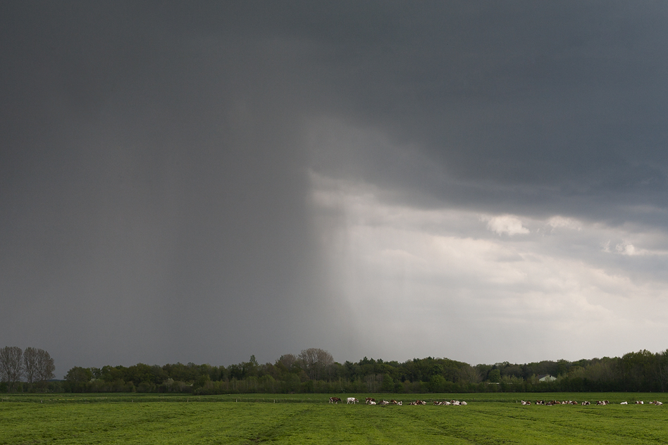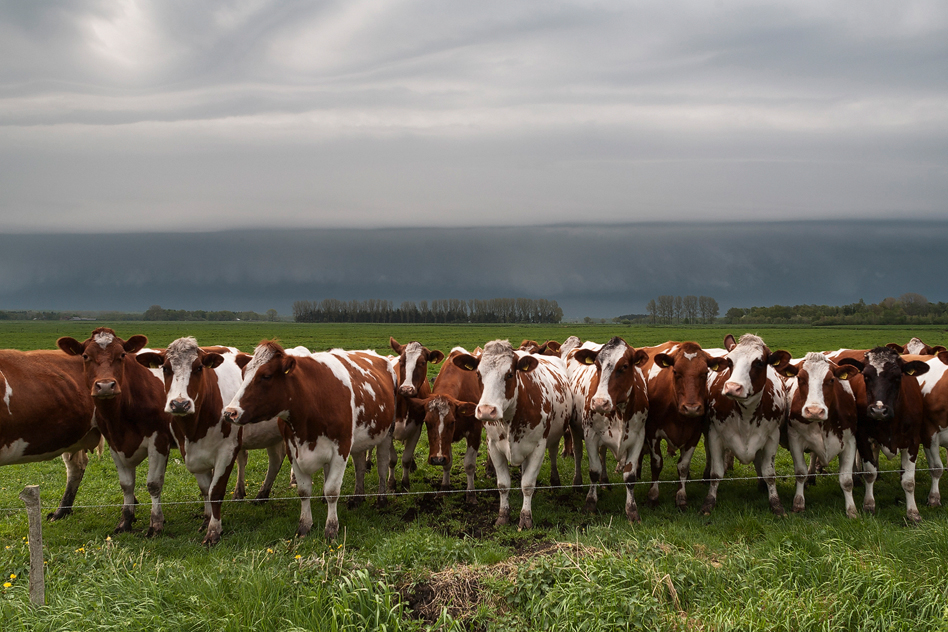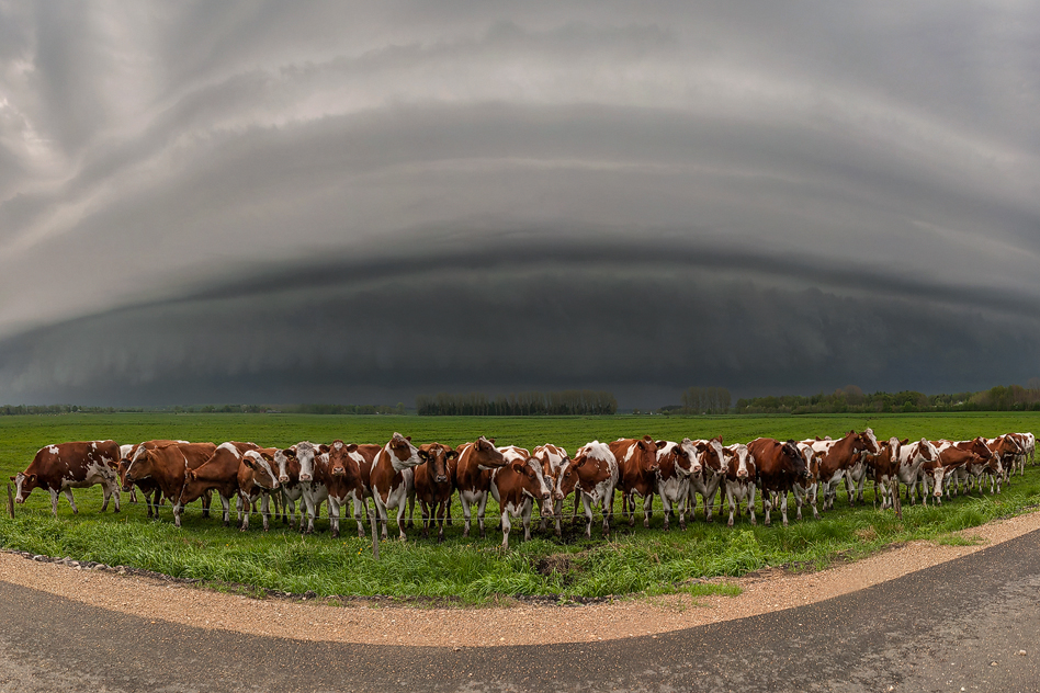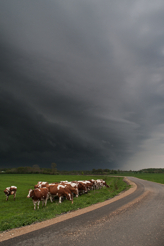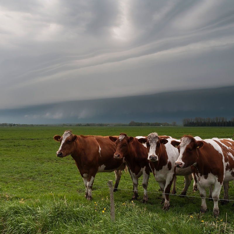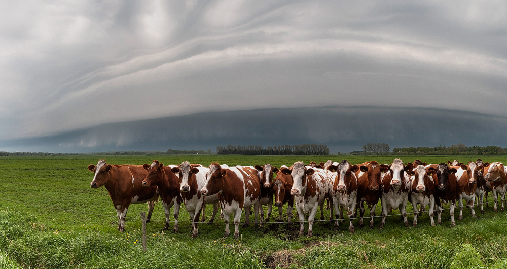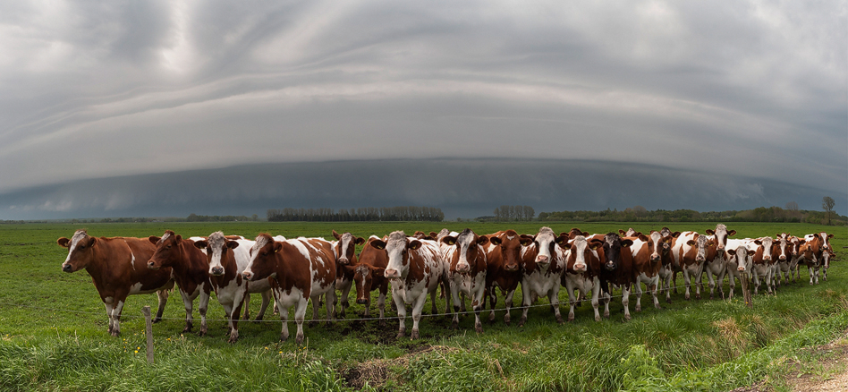 Links: Hereinziehende Shelfcloud mit Kühen.