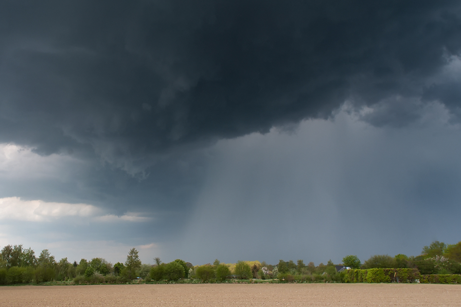 Nordöstlich zog die, dem MCS im Südwesten voraneilende, Hagelzelle ab. Das gewittrige Regengebiet war nun weniger interessant für uns und wir fuhren zurück nach Hause, um Kaffee zu trinken. Da in der Gegend UMTS oder generell Handyempfang (zumindest bei Samsung) wohl eher eine marginale Erscheinung zu sein scheint, sahen wir auch nicht mehr, dass sich der Bereich des MCS Höhe Elmshorn verstärkte. Zu Hause angekommen (Hademarschen) staunten wir nicht schlecht, als plötzlich enormer Starkregen und teils auch deftige Naheinschläge herunter gingen.