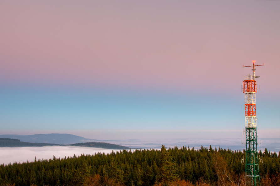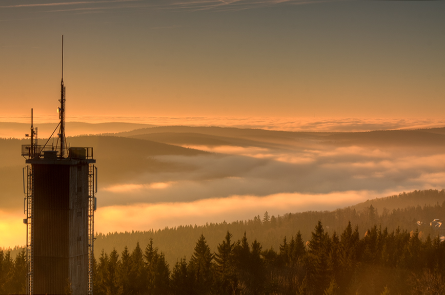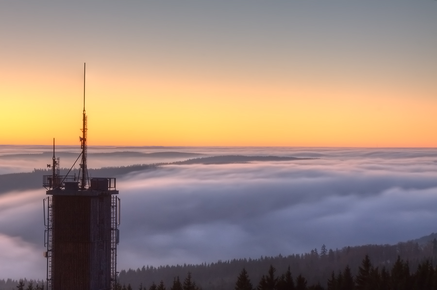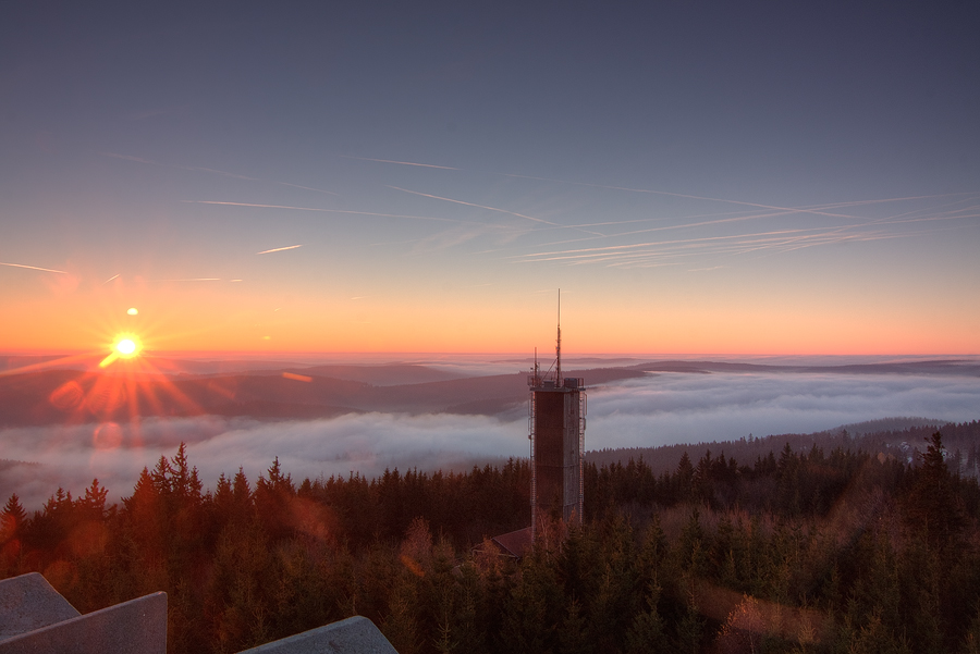 Die Bedingungen für diesen Tag sollten stimmen, die Grenze der Inversion noch so niedrig liegen, dass die Gipfel Thüringens bequem aus der Suppe ragen würden. Zwar herrschte zur Abfahrt in Weimar Nebel, doch lichtete der sich unterwegs zunehmend und betraf nur die typischen Senken. In der Ruhe der Nacht ging es vom Wanderparkplatz hinauf zum Aussichtsturm auf den Kickelhahn. Oben angekommen, war der helle Schimmer am Osthorizont zu sehen.