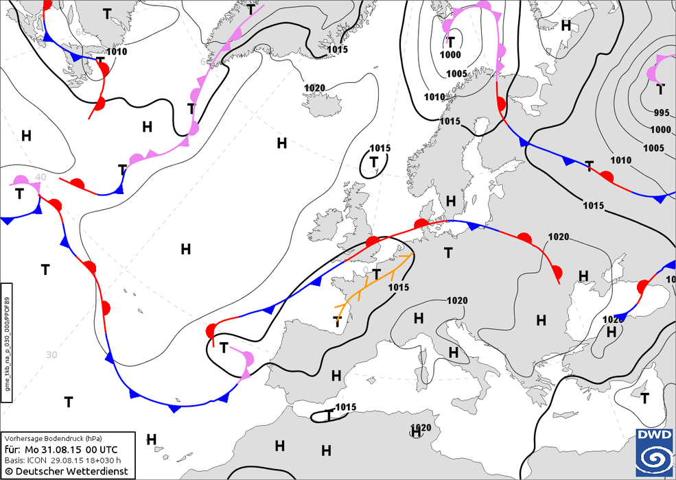 Heute: Thüringen verbleibt im Einfluss des Hochs über Osteuropa ohne dass Frontpassagen zu erwarten sind. Vom Atlantik her nähert sich der westeuropäische Langwellentrog samt Frontalzone und Jet dem europäischen Festland: