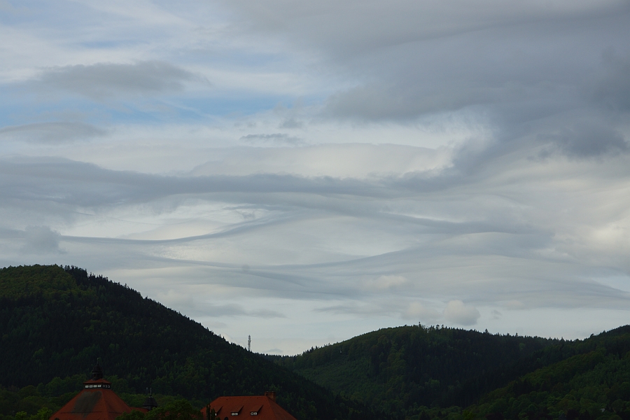 Diese Wolkenformation wurde durch eine überlagerte Höhenströmung gebildet. Blickrichtung Süden, auf das westliche Thüringer schiefergebirge.