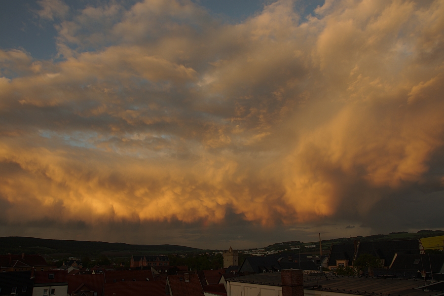 Durchzug einer Schauerstaffel, diese wurde rückseitig durch die untergehende Sonne angestrahlt. Grandioses Farbspektakel, doppelter Regenbogen mit Mammaten. Abzug in Richtung NO.