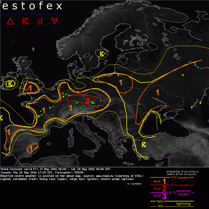 Über Deutschland wird sich eine flache Druckverteilung einstellen, in der die labile Luftmasse sich selbst mit dem Tagesgang überlassen ist ("Gewittersumpf"). Gerade die Gebirge stellen da einen guten Initiator für Konvekion dar, die dann zu größeren Clustern heranwachsen können. Lokale Konvergenzen unterstützen da gern mal. Auch sollte man die Bildung von thermischen Tiefs ("Hitzetefs") mit in Betracht ziehen. Ohnehin wird für Sonntag ein Tief über Mitteldeutschland simuliert. Dann drohen lokale Unwetter durch Starkniederschlag und Hagel.