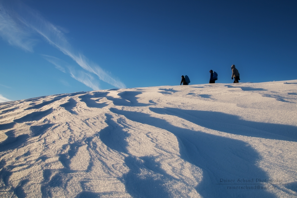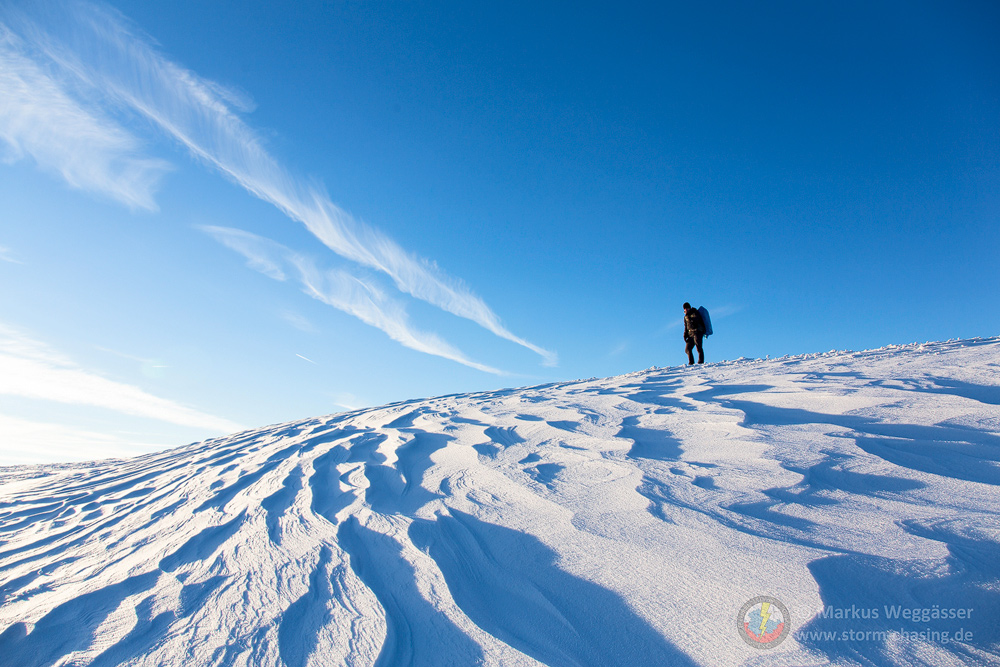 Schöner Cirrus über Schneeverwehungen mit Marco drauf: