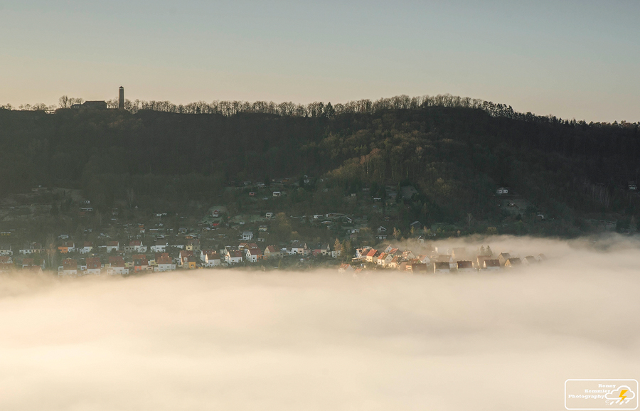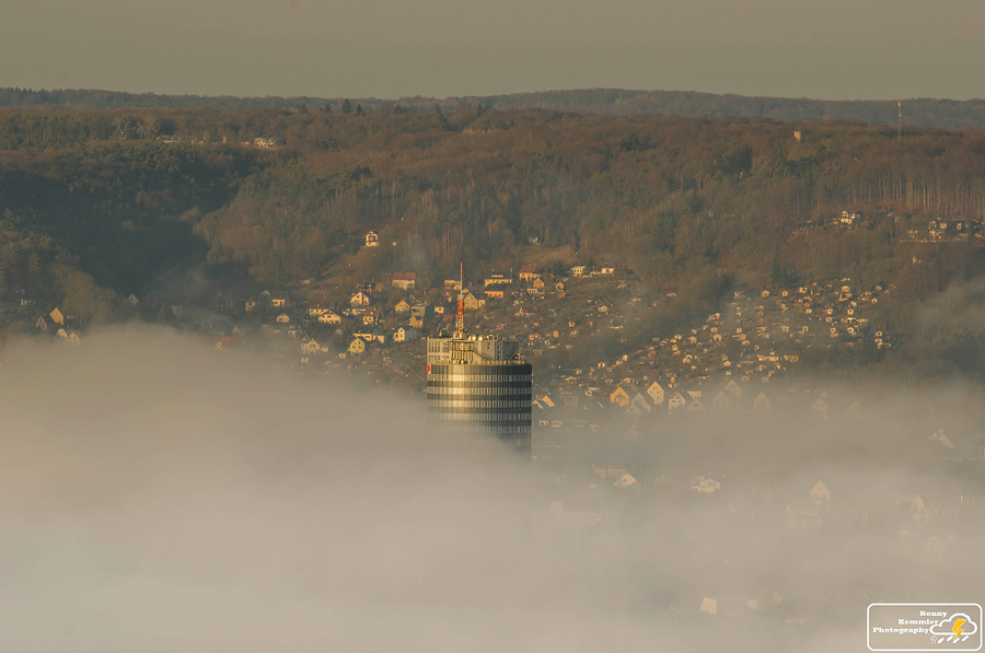 Wenigenjena vom Nebel noch nicht komplett geflutet und darüber thront der Fuchsturm
