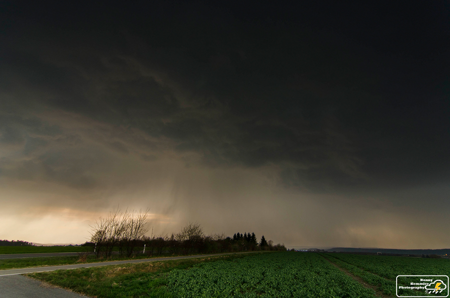 Kurzer Radarcheck auf dem Smartphone und die weitere Planung stand. Es ging nach Mörsdorf, wo ich auf Kay aus Jena traf. Kurze Lagebesprechnung und schon trennten sich unsere Wege. Ich blieb noch am Standort und konnte schöne Fallstreifen und Erdblitze beobachten. Im späteren Verlauf bildete sich eine Böenfront aus. Diese sah recht interessant aus und zog im langsamen Tempo weiter Richtung Norden. Also entschloss ich mich, diese Böenfront noch ein bisschen zu verfolgen.