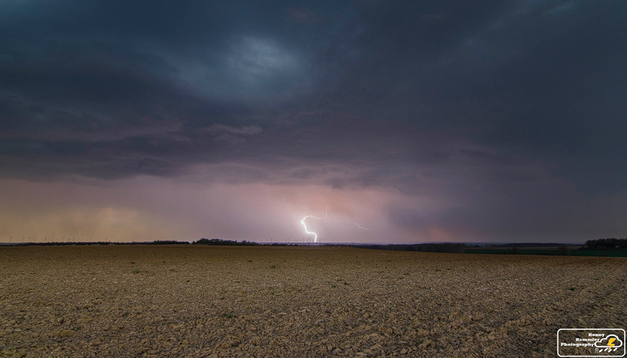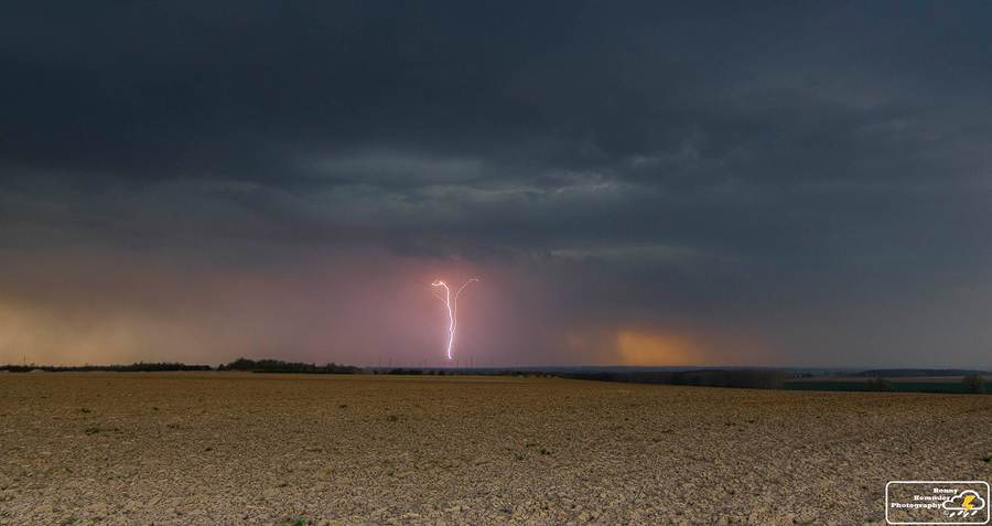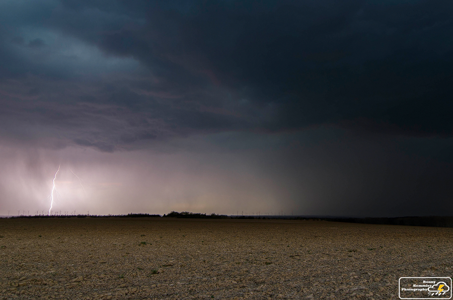 Bei Droyßig fand ich dann schnell einen geeigneten Standpunkt für weitere Beobachtungen. Da ich nun genug Vorlauf vor dem Gewittersystem hatte, konnte ich dort den Frontenaufzug in Ruhe genießen. Was mir auffiel waren die vielen Erde-Wolke Bitze. Diese sind an den Windrädern entstanden. Mit viel Glück konnte ich sogar einen in die Kamera bannen.