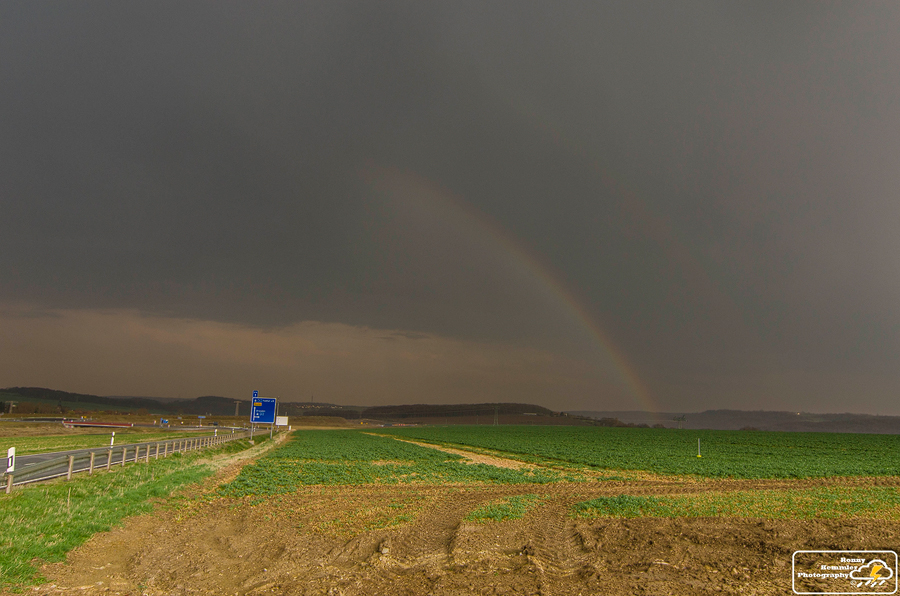 Mir wurde klar, das es hier nichts mehr zu holen gab und ich fuhr weiter nach Bucha. Begleitet von extrem nahen Blitzeinschlägen an der Autobahn, gab ich meinem Fahrzeug die Sporen, um nicht in den Kern zu gelangen. Kurz vor dem Autobahntunnel musste ich für einen schwachen doppelten Regenbogen einen Stopp einlegen.