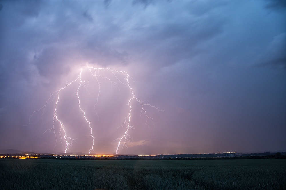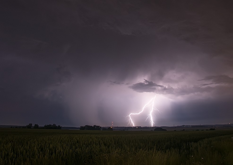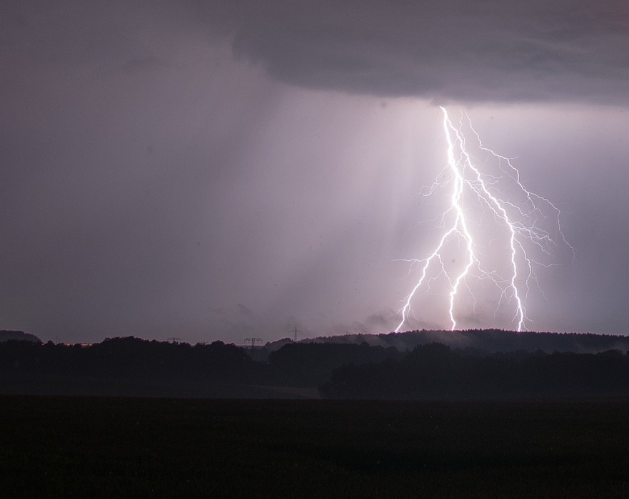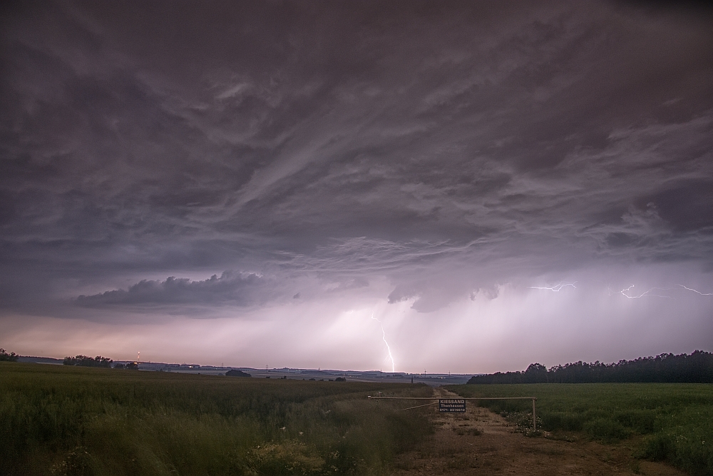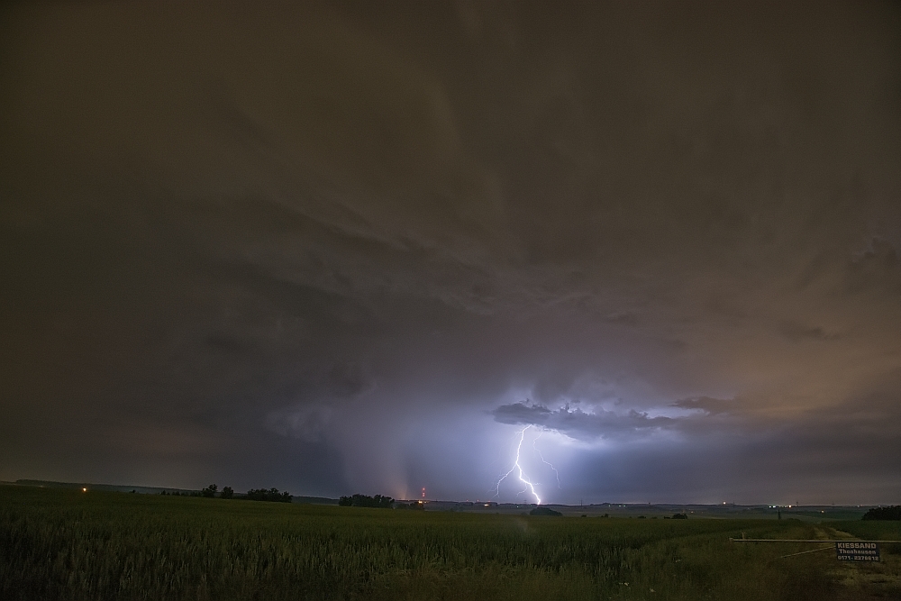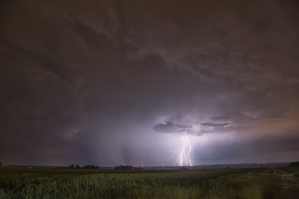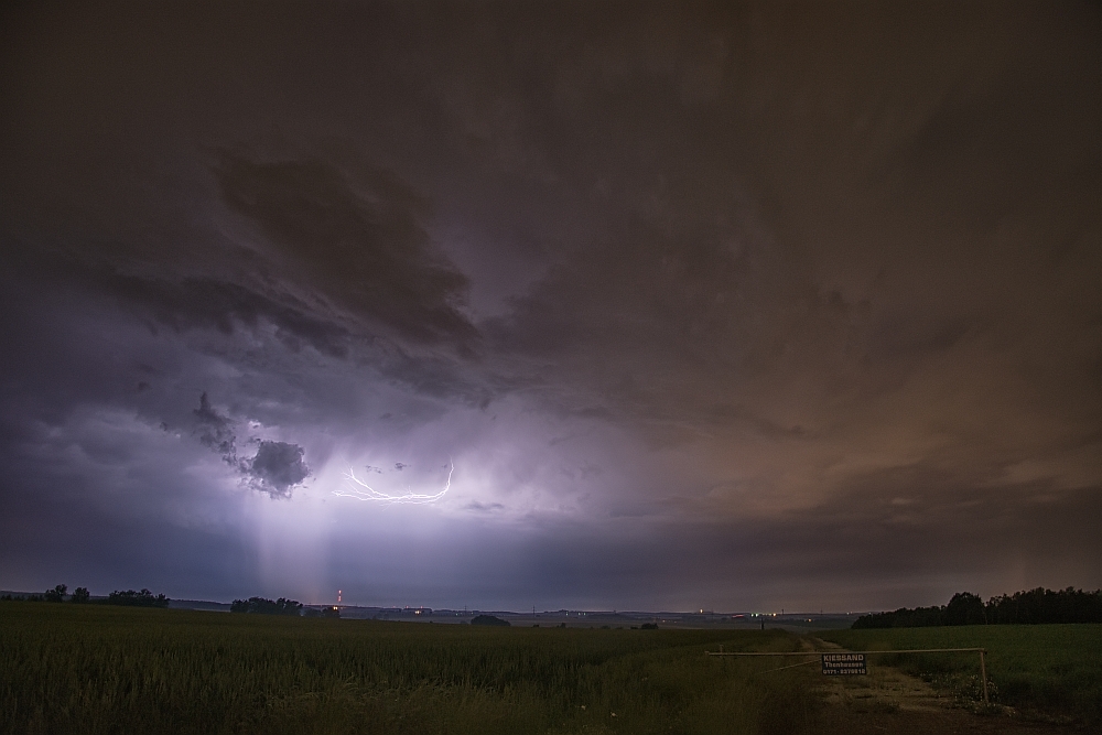 hier in aller Kürze mein Bericht vom 15.06.17. Ich war an diesem Tag mit meiner Familie am späteren Nachmittag im Garten. Dort suchte uns gegen 19:30 Uhr der erste Schauer auf, welcher einen schönen Doppelregenbogen an den Himmel und meinem Sohn ein Strahlen und Staunen ins Gesicht zauberte. Nach kurzem Radar-Check und mit dem Wissen, das etwas von Westen kommt, machte ich mich Richtung Arnstadt auf. Dort blieb ich eine Weile, aber wahrscheinlich nicht lang genug, um Markus und Ronny zu treffen. Dafür traf ich einen anderen Wetterverrückten, der auch sein Glück in der Blitzfotografie versuchte. Als dann der Regen einsetzte, machte er sich auf den Heimweg, ich verharrte noch eine Weile und hatte diesmal das Glück, noch einen ganz netten 3er Erdblitz zu erwischen.