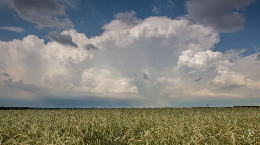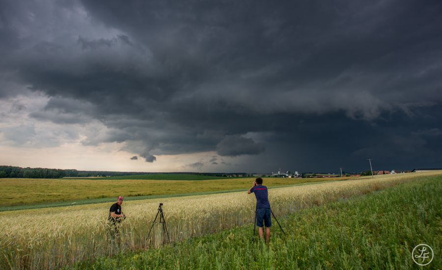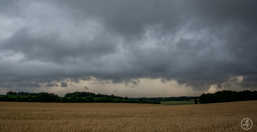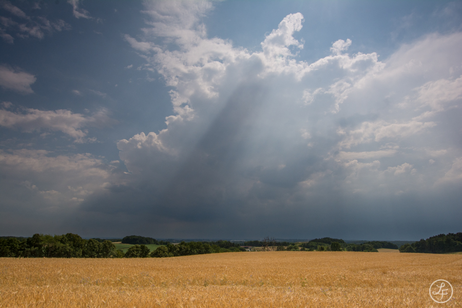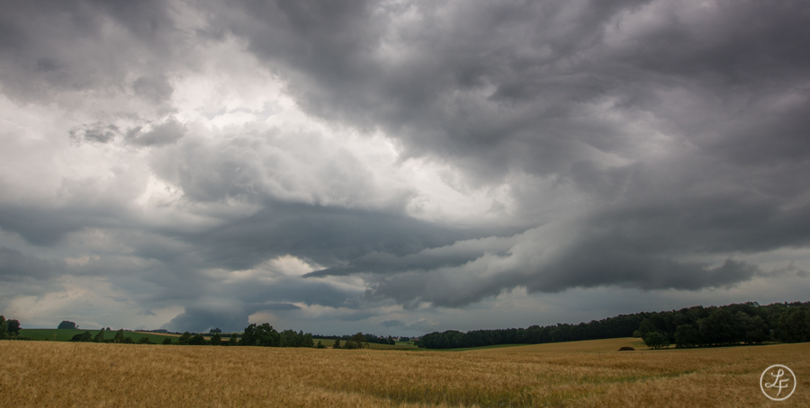 Langsam näherte sich nun die südliche Zelle, konnte uns strukturell aber nicht so überzeugen wie unser erstes Exemplar dieses Tages. Außerdem versteckte sich die kleine Böenfront hinter einem Waldgebiet, weshalb wir uns nochmal kurz einen anderen Standpunkt in der Nähe suchten. Dort setzte aber mit unserer Ankunft auch der Regen ein und den Männern gefiel der Misthaufen nicht als Vordergrund. ![]()