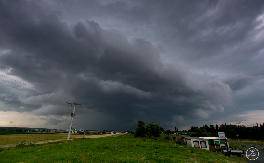 Während der Fahrt beobachteten wir die "Grimma-Zelle" fortwährend auf dem Radar und entschieden uns, bei Dresden über die A13 noch ein Stück nordwärts zu fahren, um das südliche Ende des Zellenkomplexes abzufangen. An der Abfahrt Thiendorf fanden wir schnell einen geeigneten Standpunkt und wurden schon mal mit ansehnlichen Strukturen für die Fahrt entlohnt.