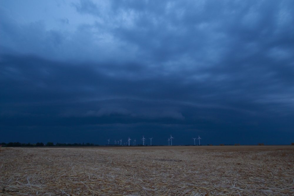 Danach entschieden wir uns weiter über die A38 Richtung Leipzig zu fahren um dann nach dem Wechsel auf die A9 die Linie vor Naumburg nochmals abzufangen. Unter einem Windrad platziert traf dann auch die Front langsam ein und Markus konnte sich der Blitzfotografie hingeben. Aufgrund meiner (möglichst mobilen) Stativ-Wahl (Gorilla Pod DSLR) war mehr oder weniger mitten im Feld fototechnisch nicht mehr viel möglich und ich genoss die letzten Minuten unseres Chasings beim Betrachten der Gewitter die noch vor uns lagen.