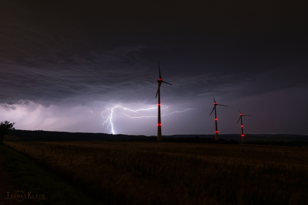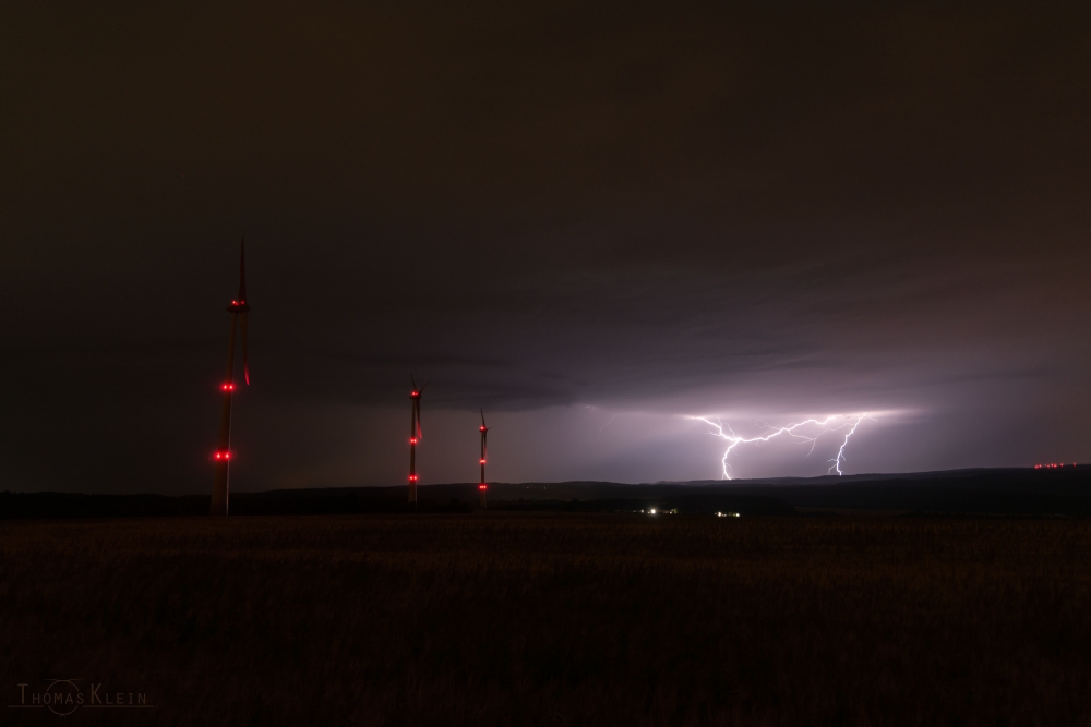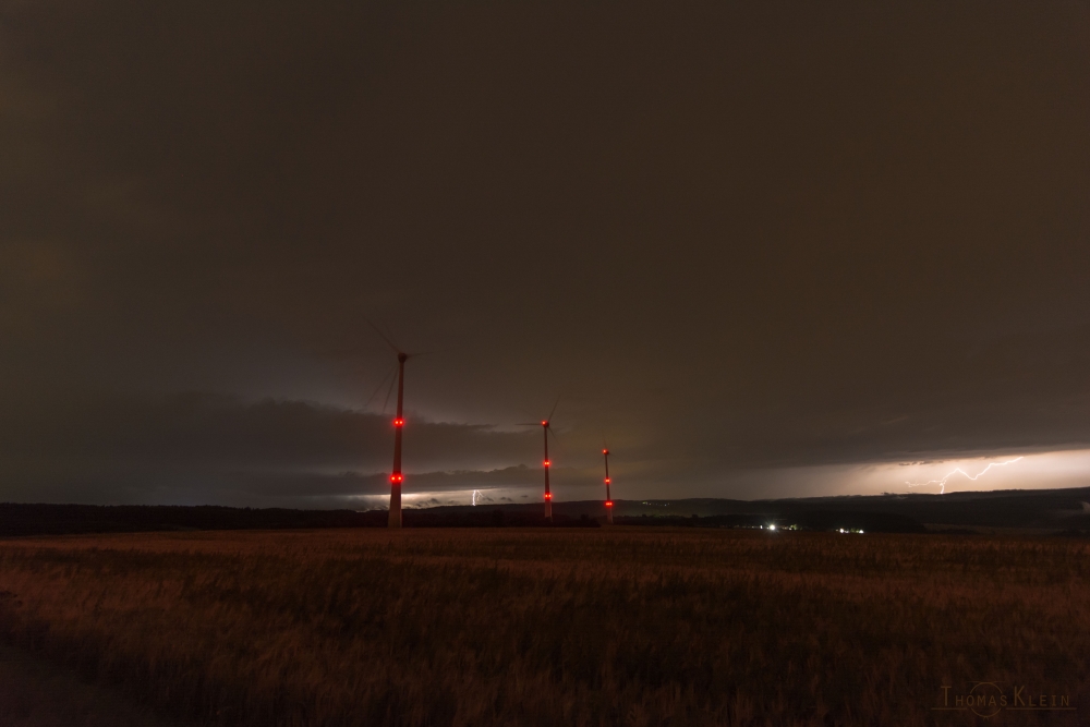 Und noch ein letzter Blitz der ersten Zelle. Schön ist an den Windrädern auch zu sehen, dass der Wind auf Inflow gedreht hatte: