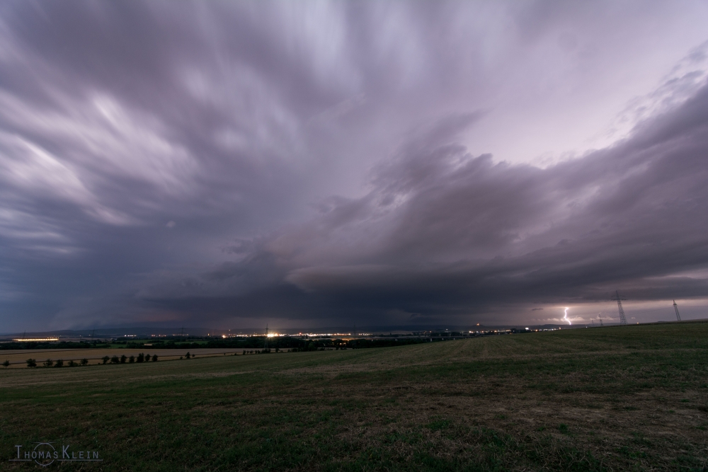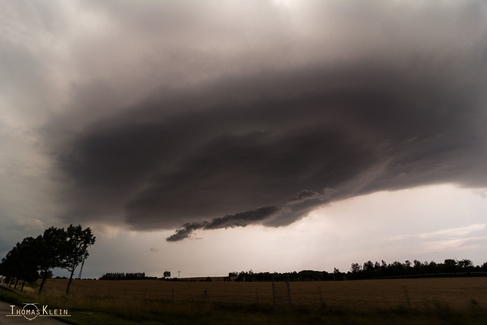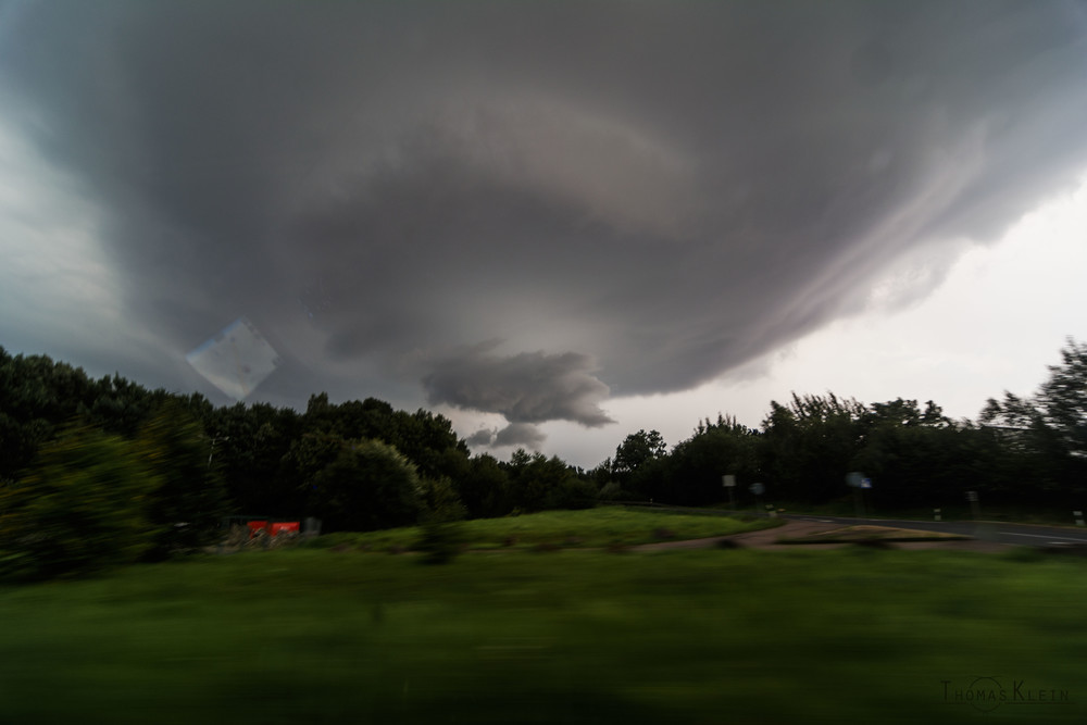 Als wir gerade zurück auf die Autobahn gefahren sind, hat sich eine zweite, äußerst fotogene Superzelle vor uns formiert, ich habe aus dem Auto draufgehalten und wahnsinns Strukturen erwischt. Kurze Frage: Ist auf dem Radarbild eigentlich ein Hackenecho zu sehen?