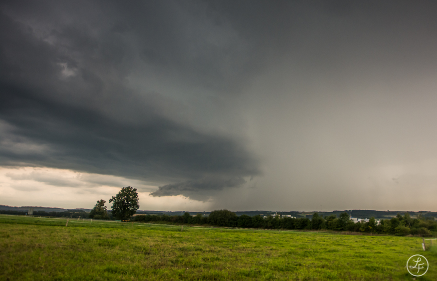 Am Dreieck Bayreuth fuhren wir auf die A9 nach Norden, um uns vor den Zellenkomplex zu setzen. Glücklicherweise fanden wir trotz hügeligem Gelände bei Himmelkron einen geeigneten Standort. Viel Zeit blieb nicht zum Fotografieren, aber die Böenfront war das Highlight des Tages.