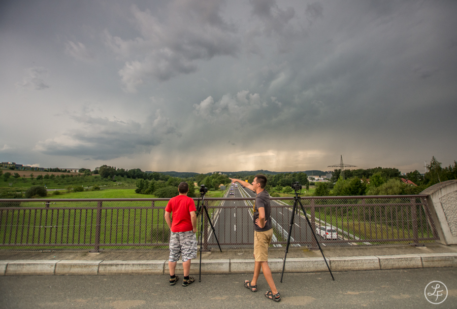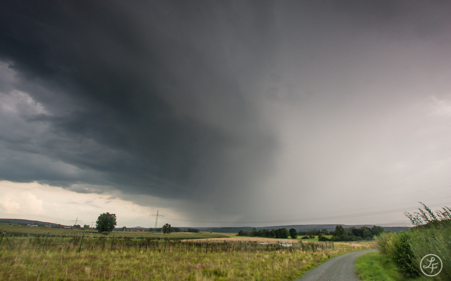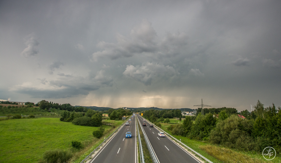 Am Dienstag den 15. August stand für Mitteldeutschland wieder eine Gewitterlage an. Estofex gab ein Level 2 heraus. Stephan und Ronny holten mich am Nachmittag in Weimar von der Klinik ab und gemeinsam brachen wir über die A71 in Richtung Süden auf. Da ich nicht ganz pünktlich rausgekommen war und wir zusätzlich noch in einen kurzen Stau kamen, verloren wir Zeit, so dass das Nordende des aus Hessen herannahenden Clusters für uns nicht mehr in Frage kam. Wir verlagerten uns über die A73 weiter in Richtung Coburg, ein für uns drei eher unbekanntes Chasinggebiet, was die Standortsuche etwas erschwerte. Wir fanden aber schließlich bei Coburg eine Brücke mit gutem Blick auf die sich aus der Gewitterlinie herausgebildete Zelle mit Starkregen und Mammati.