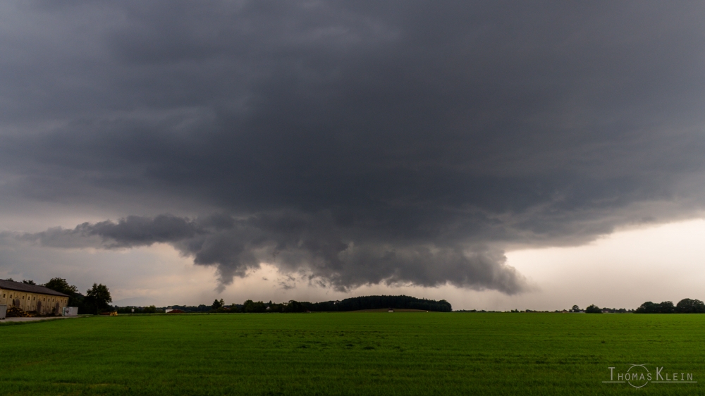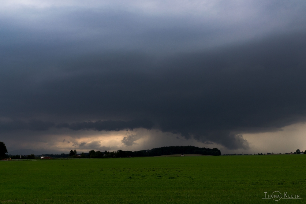 Als wir Mittags im Zielgebiet bei Wels eingetroffen waren, ist die Bodenseezelle bereits zusammengefallen und es hat Dauerregen in weiten teilen Bayerns eingesetzt. Die Luft in Österreich war sehr feucht und die Sicht entsprechend trüb. Der neue Rapid HD Lauf hat nun auch Auslöse für 14 Uhr in Salzburg gerechnet, genau wie wir es bereits vermuteten. Um 14:20 Uhr war es dann auch schließlich soweit, südlich von Salzburg ist die erste Zelle entstanden. Die Zuggeschwindigkeit war mit etwa 30km/h anfangs relativ langsam, doch die Zelle hat sich gut gemacht und ordentlich an Fahrt aufgenommen. Nachdem die Zelle angefangen hat, nach rechts auszuscheren, haben wir unsere Position etwas nach Süden verlagert und haben südlich von Lambach gewartet. In der Ferne war die Zelle schon zu sehen und es war ein mässiger Inflow zu spüren.