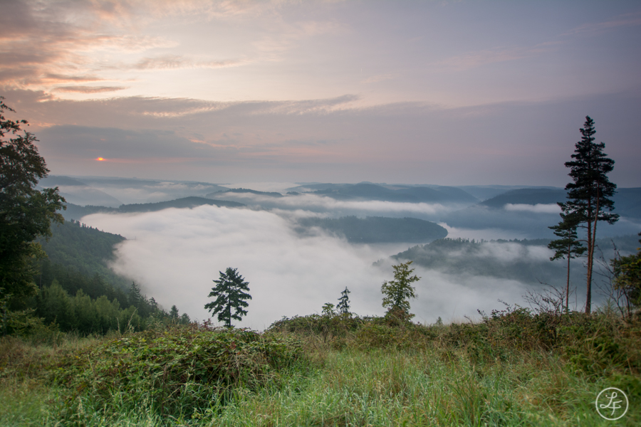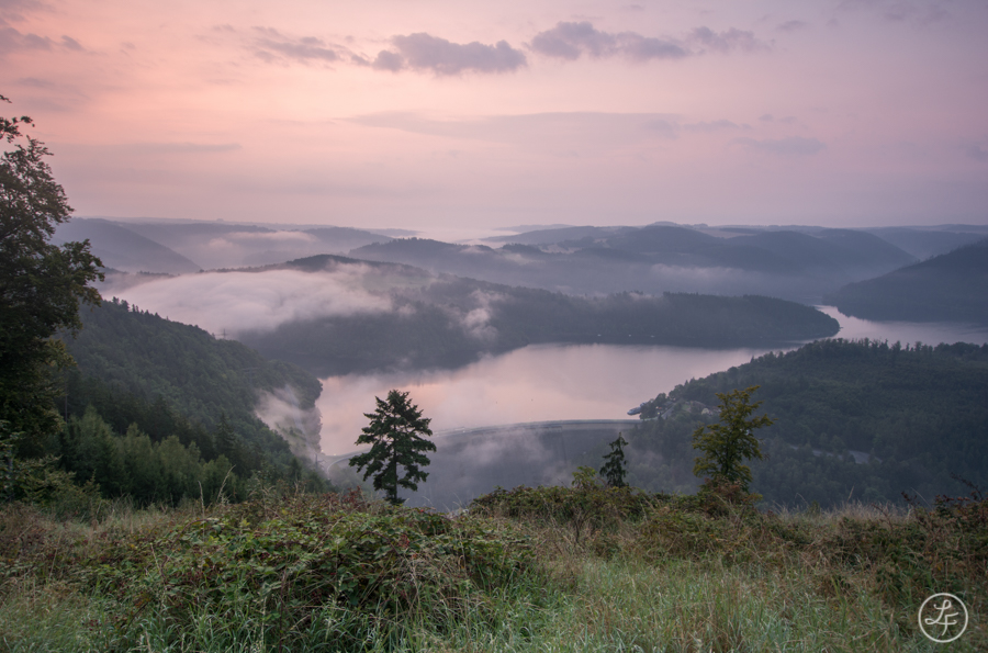 Am letzten Wochenende waren Ronny und ich zum Zelten an der Hohenwarte-Talsperre. Neben Badespaß und schönen Wanderungen, hofften wir auch auf die Gelegenheit zur Nebelfotografie. Durch die morgendlichen Gewitter am Samstag war dies zunächst nicht möglich. Auf einer Wanderung machten wir aber schon einen schönen Aussichtspunkt für den nächsten Morgen aus. Am Sonntag verließen wir dann um 5 Uhr unser Zelt (nach gerade einmal rund 3 Stunden Schlaf, Dank der "netten" Zeltnachbarn... :? ). Vom kleinen Örtchen Bucha aus wanderten wir rund 20 Minuten zum Aussichtspunkt "Gustav´s Ruh", von wo aus man Blick auf die Staumauer und einen Teil der Talsperre hat. Noch war nicht allzu viel Nebel zu sehen, die Staumauer lag noch frei, und die Dämmerung tauchte die Szenerie in ein warmes Licht.