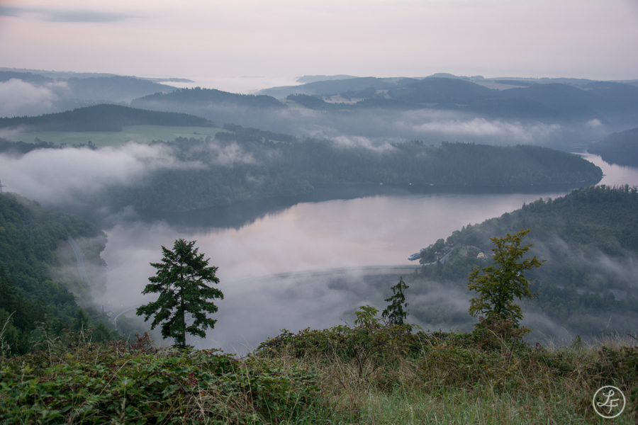 Hin und wieder wurden die Wolken dichter und so änderte sich die Farbgebung um uns herum ständig. Der Nebel nahm langsam zu und füllte zunehmend auch das Tal der angrenzenden Talsperre Eichicht. Über den weiter entfernten Teilen des Hohenwarte-Stausees füllte der Nebel das gesamte Tal aus (in Richtung Horizont zu sehen).