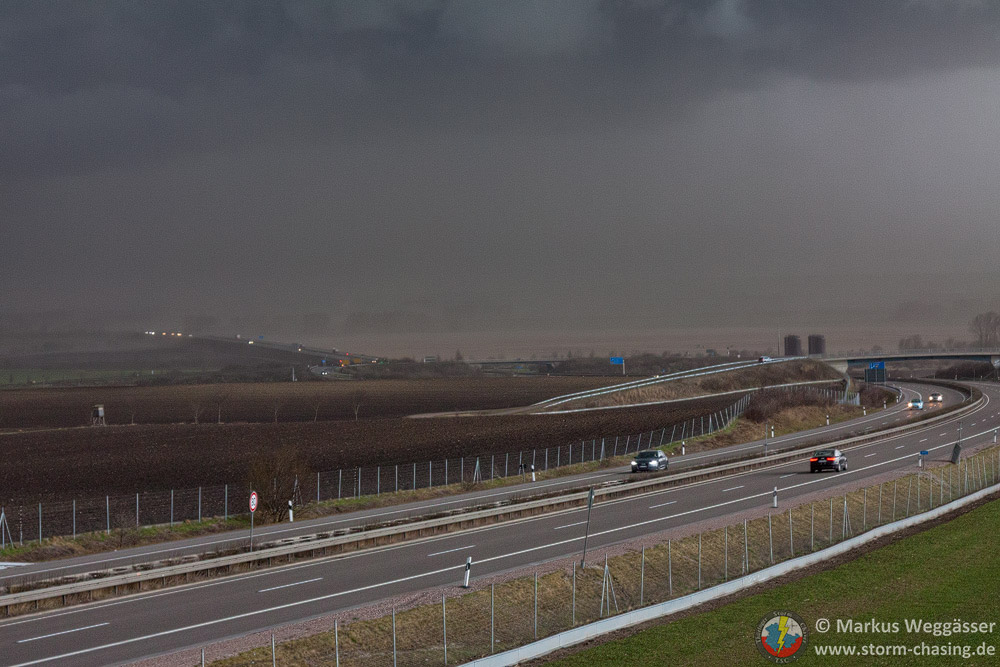 Durch die Umleitung in Kühnhausen mussten wir über Mittelhausen ausweichen. Der kurze Stopp an der Baustellenampel sorgte dafür, dass wir nun in der [definition=14,0]Böenfront[/definition] waren. Heftige Böen wackelten am Auto, wirbelten überall Staub auf und beeinträchtigten die Sicht. Wir sahen mehrfach links wie rechts von uns auf freiem Feld oder Grundstücken kleinräumige kurze Wirbel. Kurz vor der Autobahn noch ein schnelles Foto: