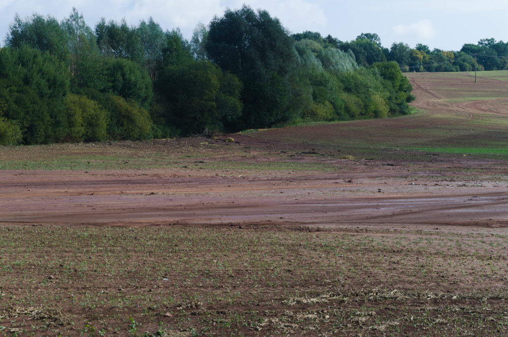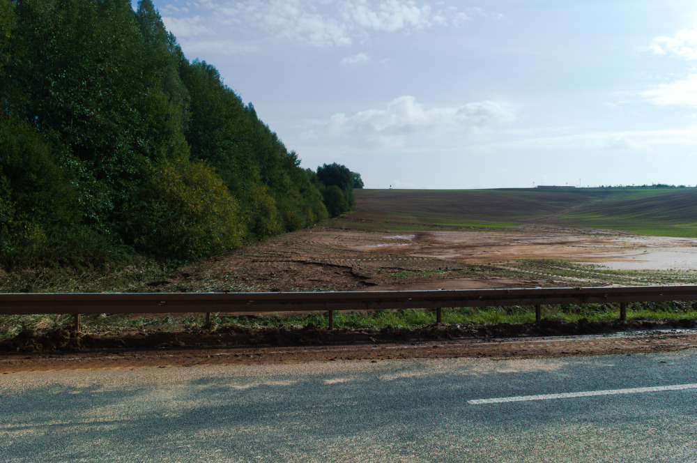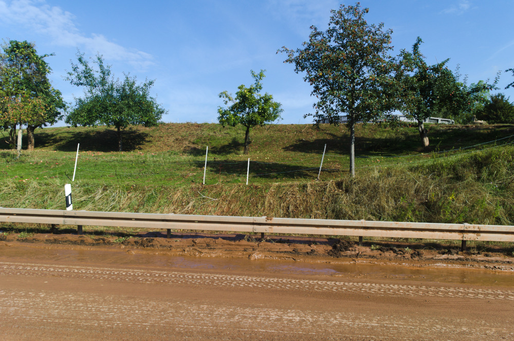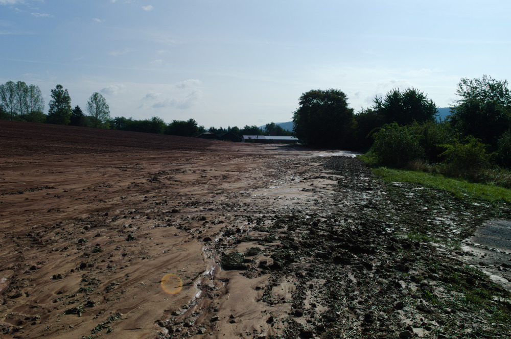 Schlammansammlung am unteren Feldrand. Straße verläuft rechts hinter den Gebüsch