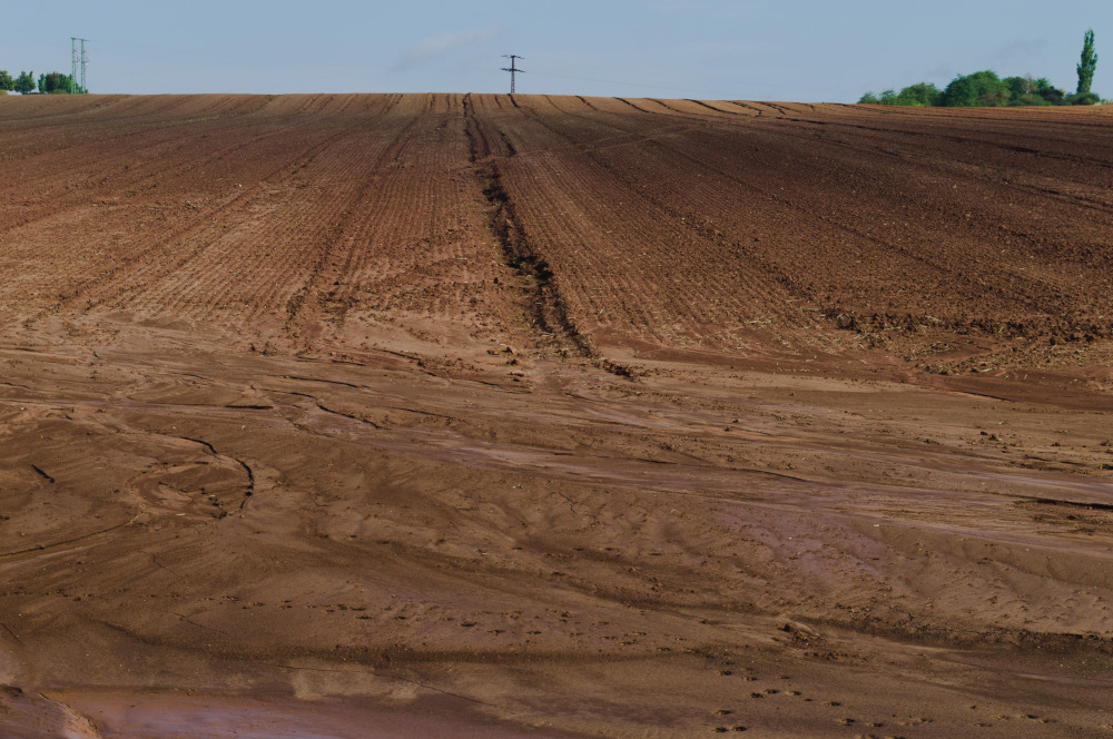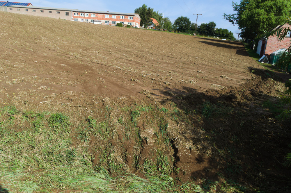 Die zwei analytisch wertvollsten Bilder. Wasserrillen um die 20cm tief. Natürlich nutzt das Wasser vorzugsweise Spurrillen oder Ackerstruktur die vorgegeben ist.