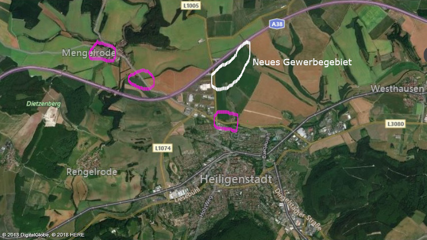 Im Norden von Heiligenstadt befindet sich eine Umgehungsstraße aus Richtung Leinefelde in Richtung A38 (siehe lila Markierung = Schadensgebiete). Dort angrenzend liegt ein aufsteigendes Feld, was zum Zeitpunkt bereits gepflügt war. Etwas weiter nördlich wird gerade ein neues Gewerbegebiet erschlossen. Dort gab es vor einiger Zeit auch den Staubsturm über den ich auch berichtete. Kurz am Rande: Wir wissen ja was passiert wenn es immer mehr große verdichtete Flächen gibt. Inklusive der Hanglage sind dann solche Ereignisse leider vorprogrammiert.