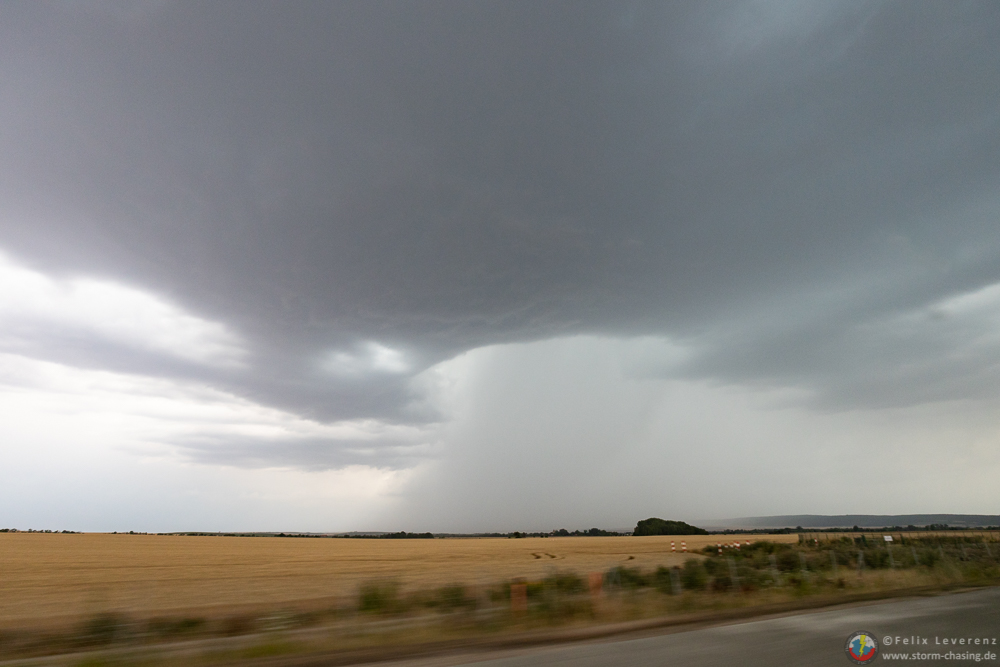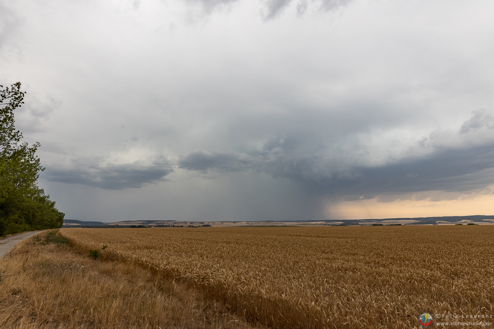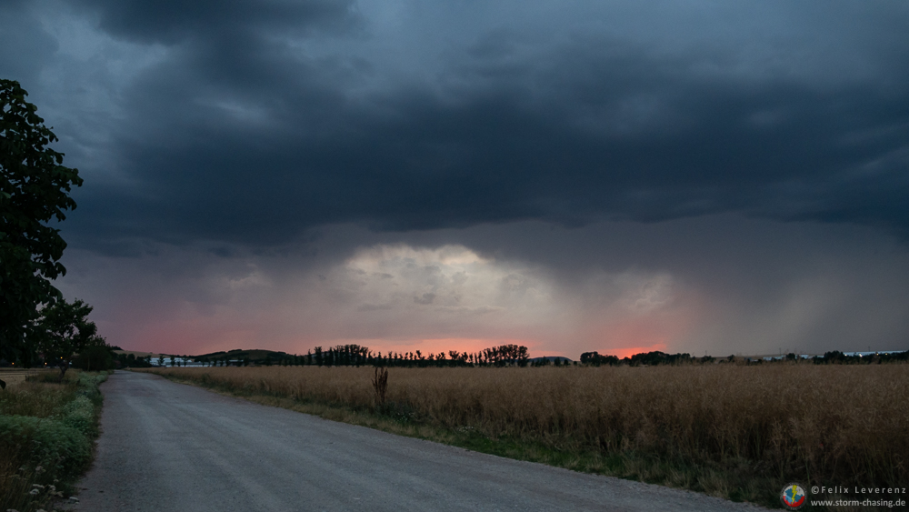 Doch sehr überrascht von der plötzlichen Intensivierung ging es bei Leubingen direkt wieder von der Autobahn runter und auf den nächsten Feldweg. Aufgrund der Radarindikation, der möglichen Hagelgröße sowie der erkennbaren Rotation auf dem Doppler Radar (bestätigt durch die gute Abgrenzung der [definition=8,3]Basis[/definition]) wage ich hier mal vorsichtig der Begriff "[definition=101,0]Superzelle[/definition]" in den Raum zu werfen. Nach der Intensivierung hielt sie ja auch eine ganze Weile durch. Wer nachverfolgen möchte kann sich dazu (zusätzlich zu den oben Eingebundenen) die entsprechenden Karten vom 20.07. ab 19:45/20 Uhr anschauen. Eine tiefhängende [definition=115,1]Wallcloud[/definition] bildete sich jedoch meines Erachtens nicht aus.