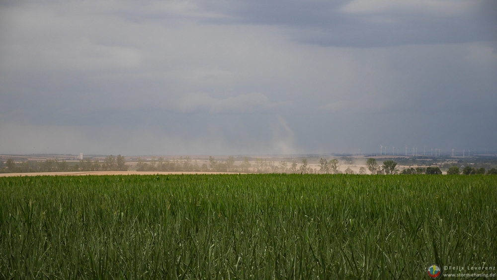 Die Zelle bewegte sich langsam weiter nordostwärts, nachdem wir den Abzug genau verfolgt hatten, war es jedoch zu spät um nochmal effektiv vor die eintreffende Linie zu kommen. In der Ferne waren bereits eine kleinere [definition=14,0]Böenfront[/definition] sowie stärkere Staubaufwirbelungen zu sehen.