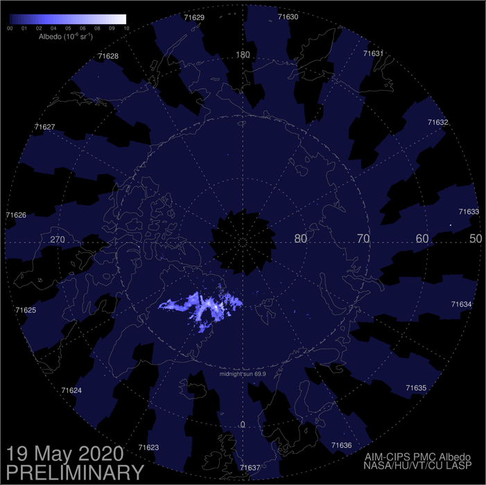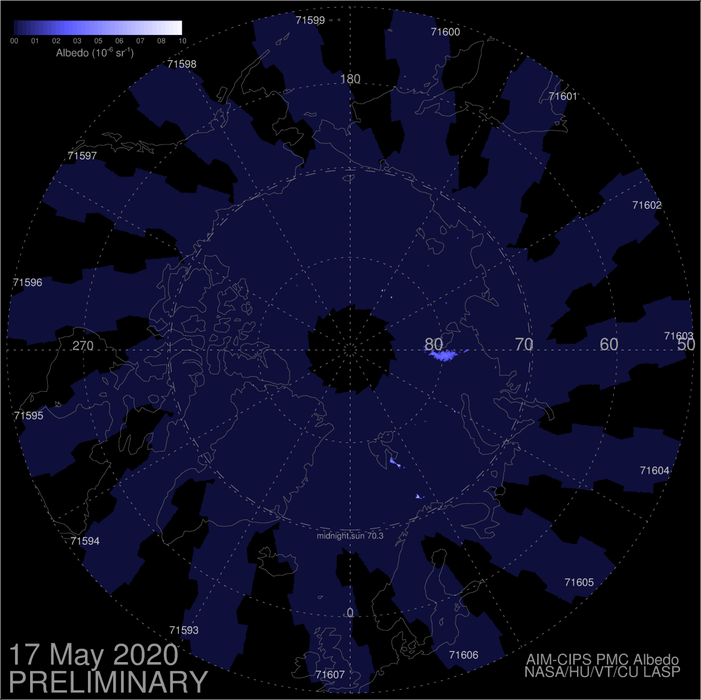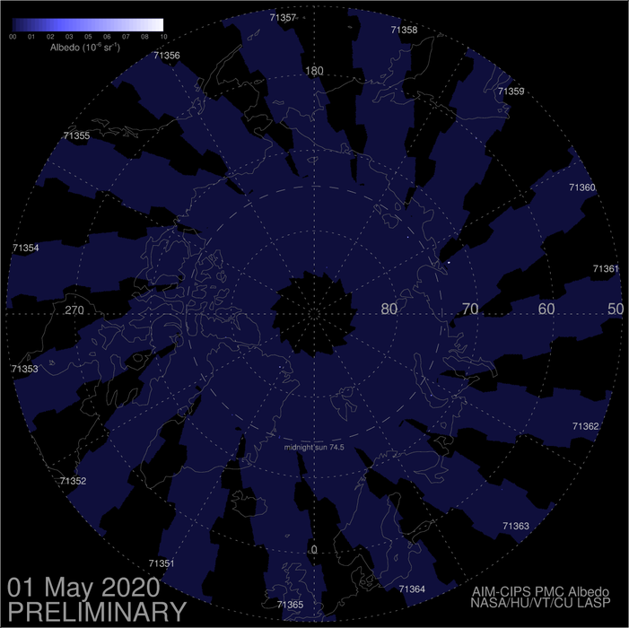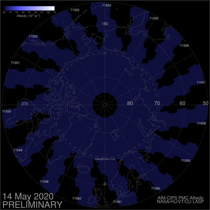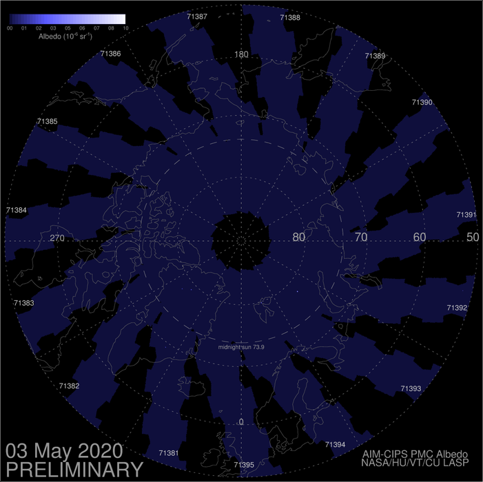 Der AIM Satellit hat nur wieder seine Position über dem Nordpol eingenommen und hat heute das erste Bild gesendet. Dieser Plot wird inzwischen täglich aktualisiert. AIM dient dazu, das Klima des Mesosphäre näher zu erforschen. Mehr Infos zur AIM Mission findet ihr hier: -> AIM - eoPortal Directory - Satellite Missions