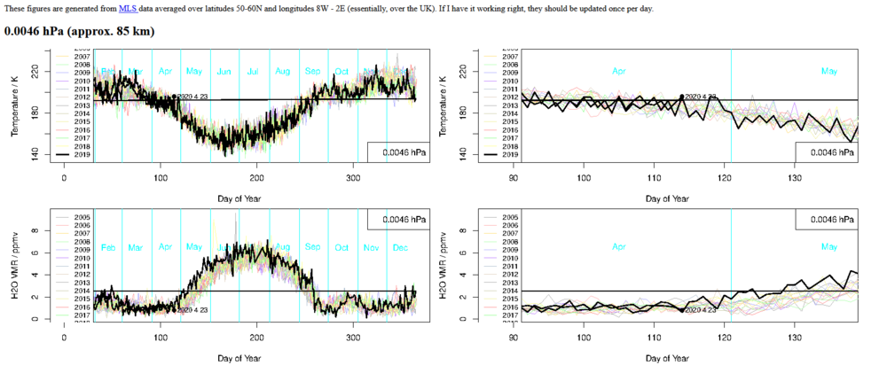 Aktuelle Messungen über UK lassen auch noch keine NLC Entstehung zu. Die Aktualisierung ist aber auch schon wieder lange her. Der Kollege scheint nicht immer Zugriff auf den Plot zu haben. Der MLS Plot wird aus den Daten vom "Microwave Limb Sounder" gewonnen und in der entsprechenden Grafik aufbereitet. Die dicke schwarze horizontale Linie zeigt den Punkt, an dem die Bedinungen zur Bildung von NLCs über Großbritanien gegeben sind.