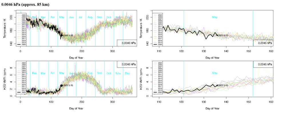 Ihr könnte aus den Grafiken jeweils die Temperatur und den Wasserstoffgehalt in der Mesopause ablesen. Jahreszeitliche Schwankungen sind dort deutlich zu erkennen. Mehr gibt es hier: -> Microwave Limb Sounder Home