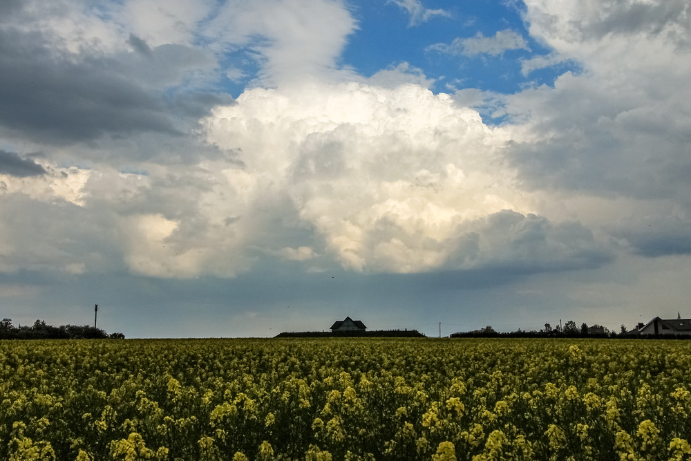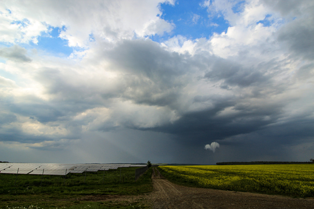 Gestartet sind wir gemeinsam von Bucha aus gegen 16 Uhr, als die Konvektion schon zunehmend in Gang kam. Während erste dicke Tropfen schon fielen, hielten wir im Nachbardorf kurzzeitig mal an: