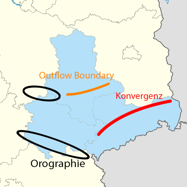 Die Outflow Boundary dieser Entwicklung über Sachsen-Anhalt dürfte bald auch weiter südlich für zunehmende Konvergenz sorgen. Sollte es dort ebenfalls zu solchen starken Entwicklungen kommen, könnte die nächste Welle am Abend auch in Thüringen noch für Auslöse sorgen.