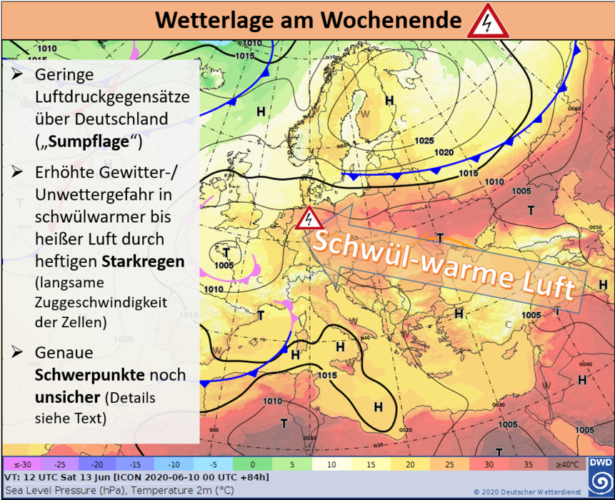 Für das Wochenende (13.06./14.06.) besteht die Gefahr von (schweren) Gewittern durch Starkregen mit lokalen Überflutungen. Auch für Freitag besteht ein geringes Gewitterrisiko. Updates folgen.