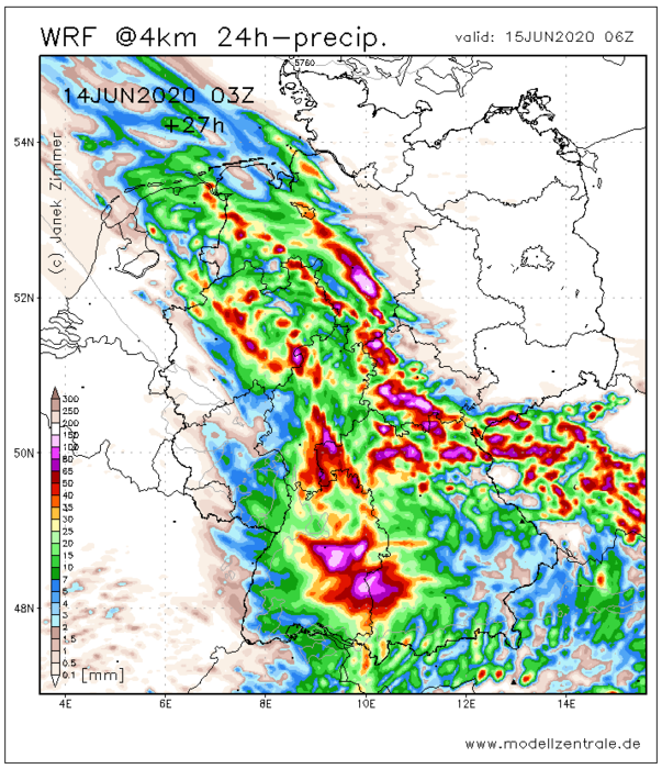 In der Summe steht also durchaus ein weiterer Tag mit Unwetterpotenzial bezgülich Stark-/Dauerregen mit örtlichen Überflutungen an. Die langsame Verlagerung der Zellen bzw. Regengebiete in Zusammenspiel mit Orographie und Regionen, wo bereits viel Niederschlag gefallen ist, sorgt für hohe Gefahr neuer Überflutung und dem Ansteig lokaler Bach-/Flusspegel.