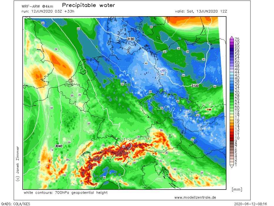 WRF-ARW möchte die Verschiebung eher südlich haben, was aber zweifelhaft anhand der aktuellen Entwicklung ist: