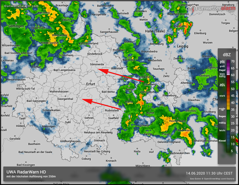 Ich ergänze mal die Radardaten zur ersten Zelle. Radar HD+, Regenradar vom 13.06.2020, 19:15 Uhr - Eichsfeld | Wetter von kachelmann.