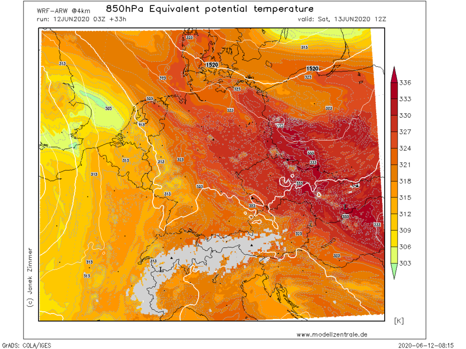 …hängt nicht zuletzt vom Samstag ab. Restwolken oder Gewitter am Morgen könnten die spätere Gewitterbildung beeinflussen. Ebenso rückt von Nordosten trockenere und stabilere Luft weiter nach Süden vor, sodass auch dies ein negativer Faktor wäre.