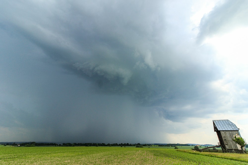 Wir gerieten in den Niederschlagskern, Erdblitze schlugen nah ein und wir fuhren auf der A9 aus der Zelle heraus, die nun mehr und mehr um sich herum neue Zellen triggerte. Zwischenzeitlich trat kurz Aquaplaning auf. Ronny und Luise hatten wir verloren und wir fuhren zunächst nach Leipzig, um eine einzelne Zelle, an der Andy dran war, abzufangen. Sie zerfiel jedoch, nur noch einzelne Mammaten waren zu sehen. Richtung Nord sahen wir den ausladenden Eisschirm des Zellkomplexes bei Wittenberg / Magdeburg. Nach kurzem Versuch, bis nach Magdeburg zu kommen, kehrten wir auf der A14 um und fuhren entlang der A9 bis kurz vor Dessau, nur um resigniert zu sehen, dass strukturell nicht viel zu holen war. Man konnte aber sehen, wie immer mehr Zellen linienartig nach Süden hin anbauten, was dann am Abend noch für Action sorgen sollte.