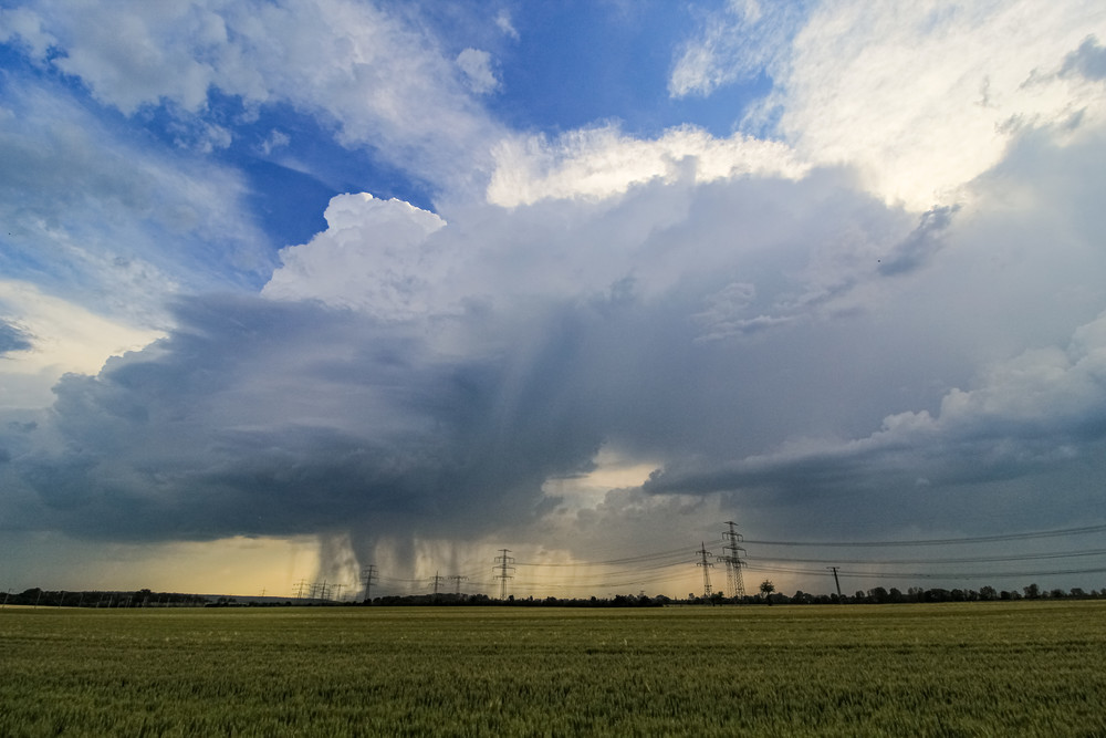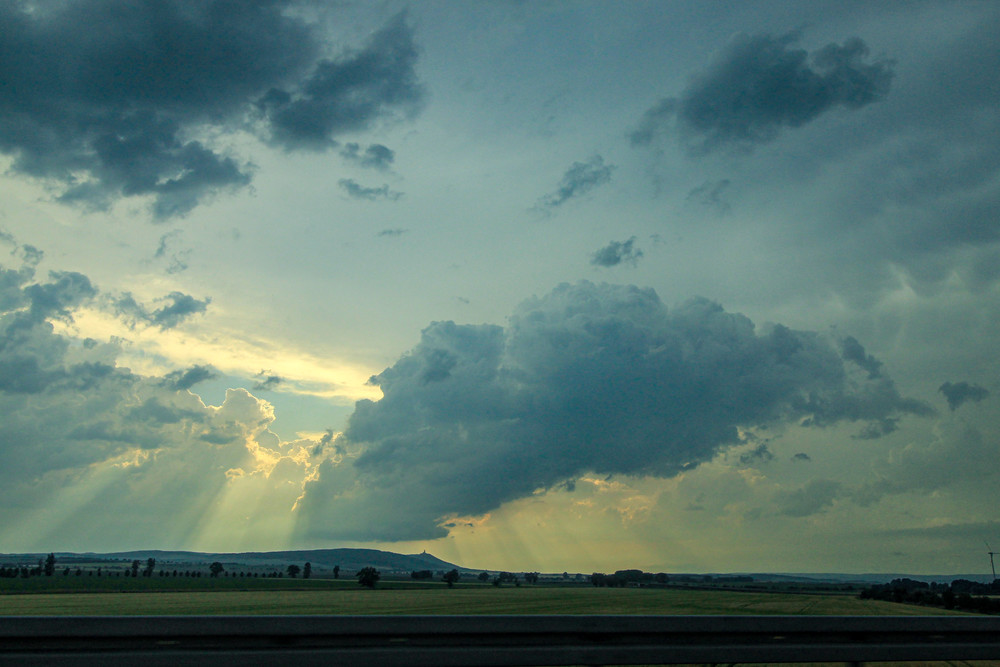 Zunächst ging es zurück zum Kreuz Rippachtal, um dort zu rasten. Die Ruhe währte jedoch nicht lange, denn schon auf dem Weg sahen wir eine freistehende Congestus, die immer weiter wuchs und kurz darauf auch schon rumpelte. Wir positionierten uns irgendwo zwischen Merseburg und Halle an der A38 und beobachteten die Zelle: