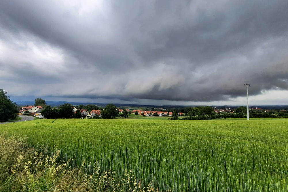 Eigentlich hatte ich an diesem Tag gar nicht mehr mit einem fotogenen Gewitter gerechnet, weshalb ich Mittag, natürlich ohne Kamera, mit dem Auto zum Essen gefahren bin. Um 13 Uhr habe ich mich schließlich auf den Heimweg gemacht, wobei ich gemütlich über verlassenen Landstraßen gefahren bin, um neue Fotospots zu entdecken. Als ich schließlich an der Trausnitzer Talsperre war, vernahm ich ein erstes Donnergrollen aus dem Norden. Das Radar zeigte eine rasante Neubildung direkt vor meiner Haustüre...bloß dass ich 40km weiter südlich war.